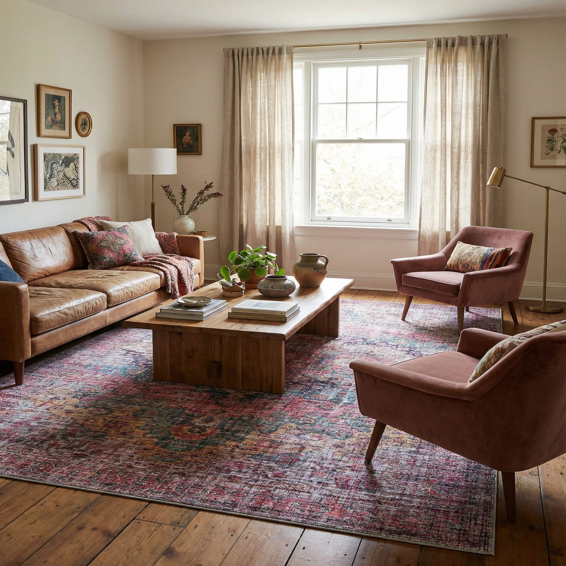 A 9x12 multi-colored rectangular Mangata rug with a distressed traditional medallion pattern, ideal for a living room.