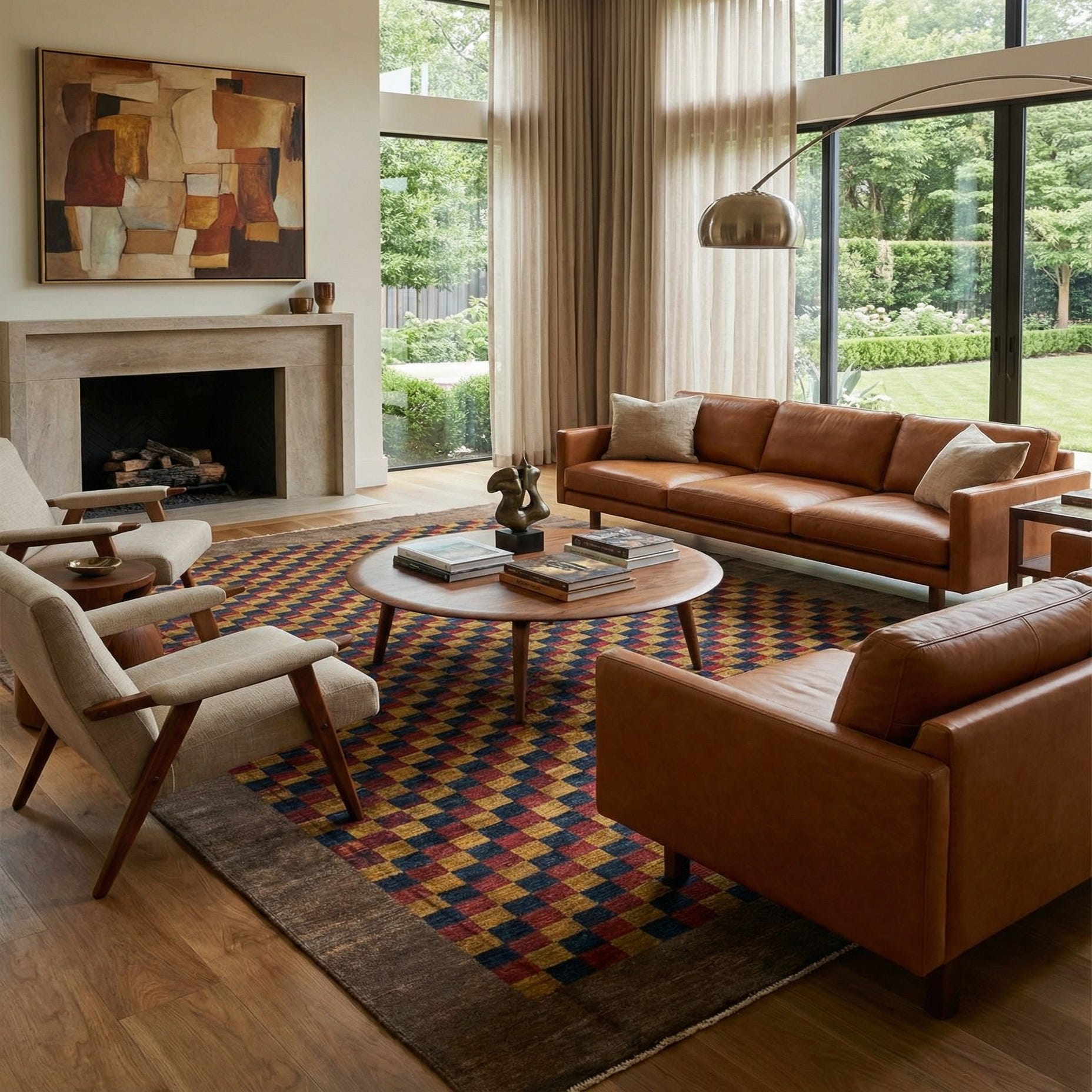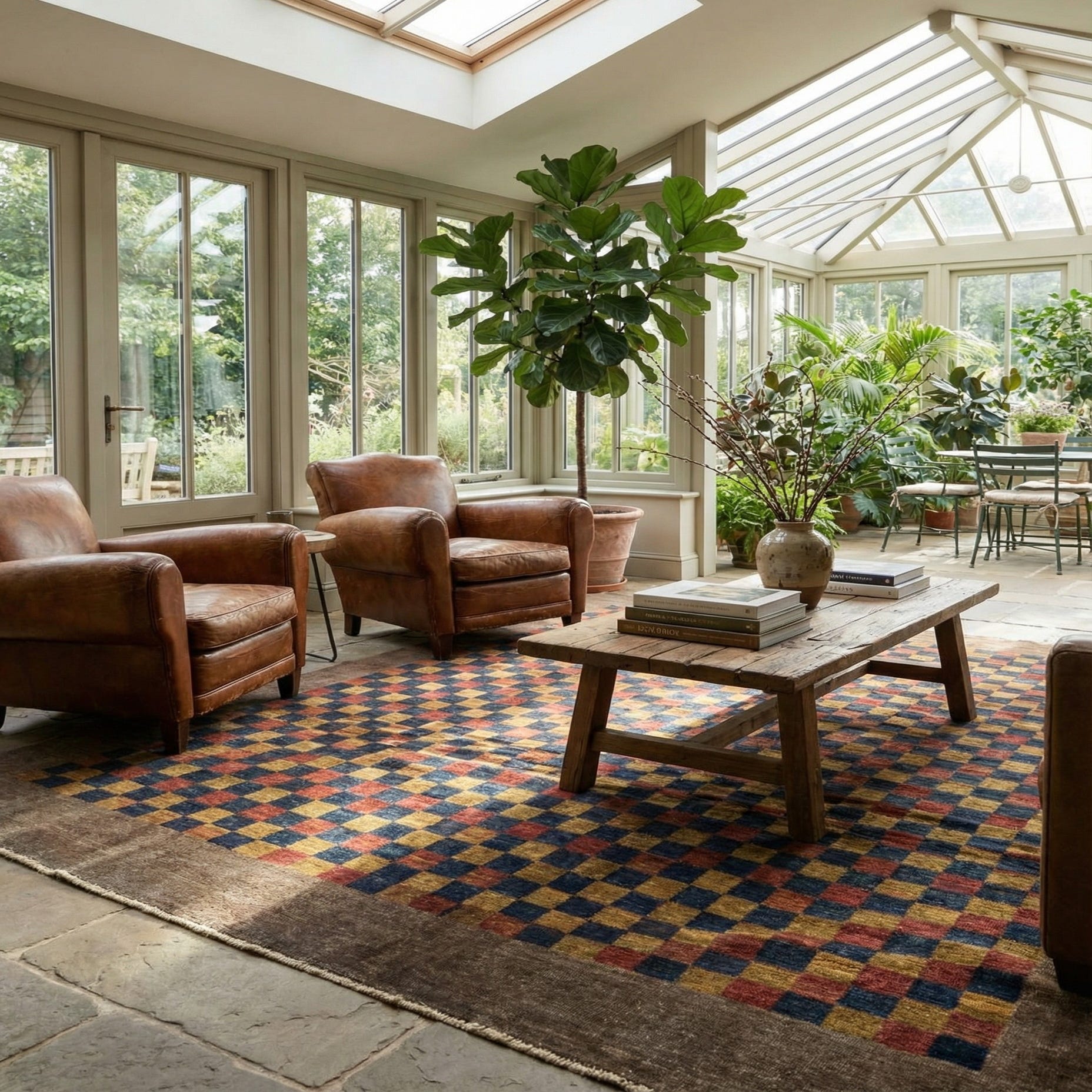 A 9x12 rectangular Modern Ziegler rug with a multi-colored checkerboard pattern and a solid brown border.