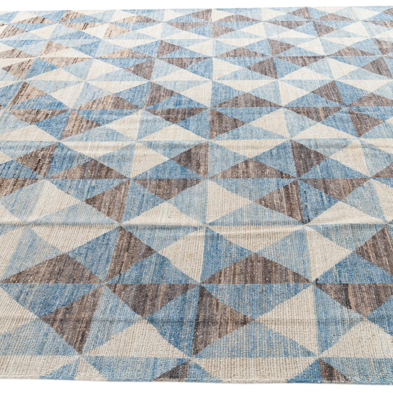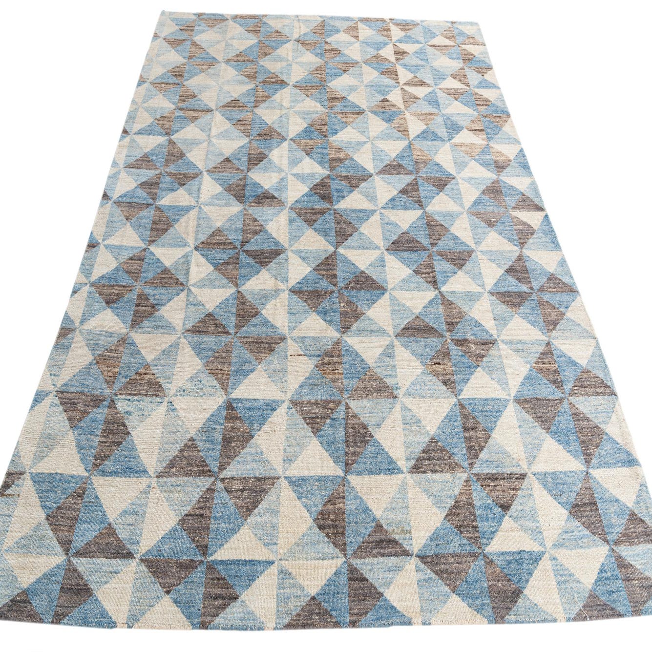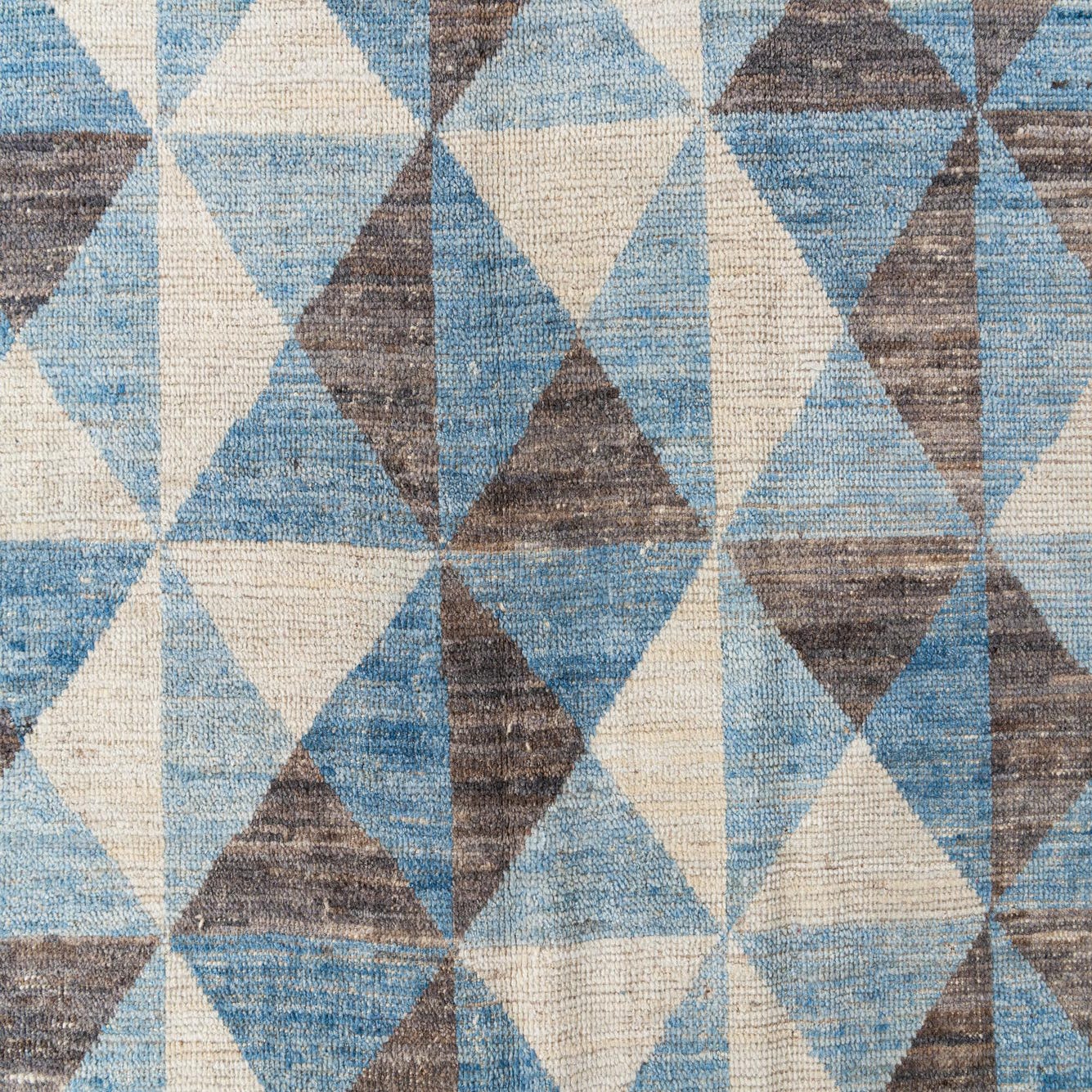 A 9x12 rectangular Moroccan wool rug with a tribal geometric pattern in shades of blue, beige, and brown.
