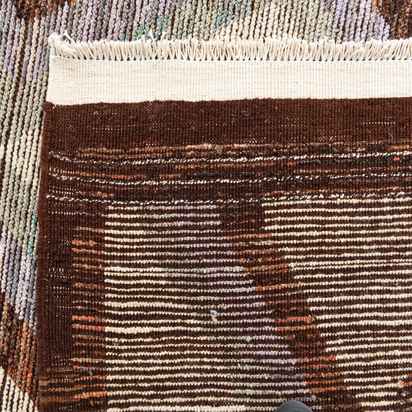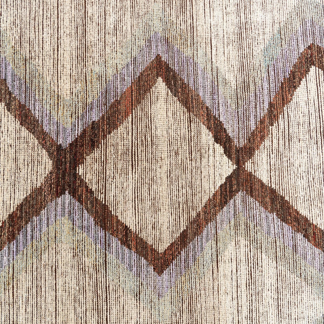 Hand-knotted in 100% wool, this rug has a tactile, slightly nubby surface that feels warm and substantial underfoot while showing the fine irregularities of skilled knotwork. It is well suited to larger living areas or placed beneath a dining table, and pairs naturally with warm wood floors, leather seating, or linen-upholstered pieces. The muted palette and geometric pattern also work in transitional, mid-century, or global-inspired interiors where a calm, layered foundation is desired.