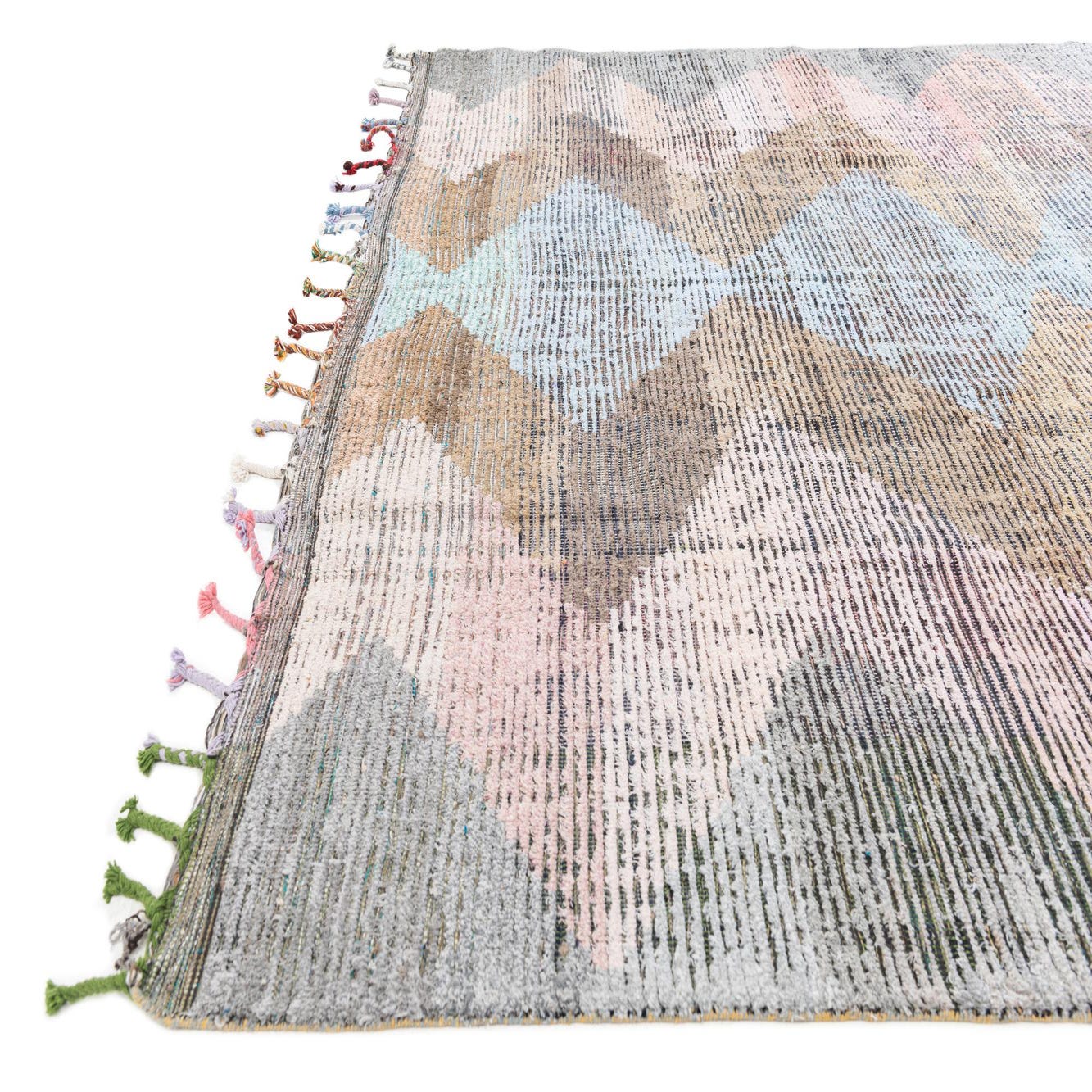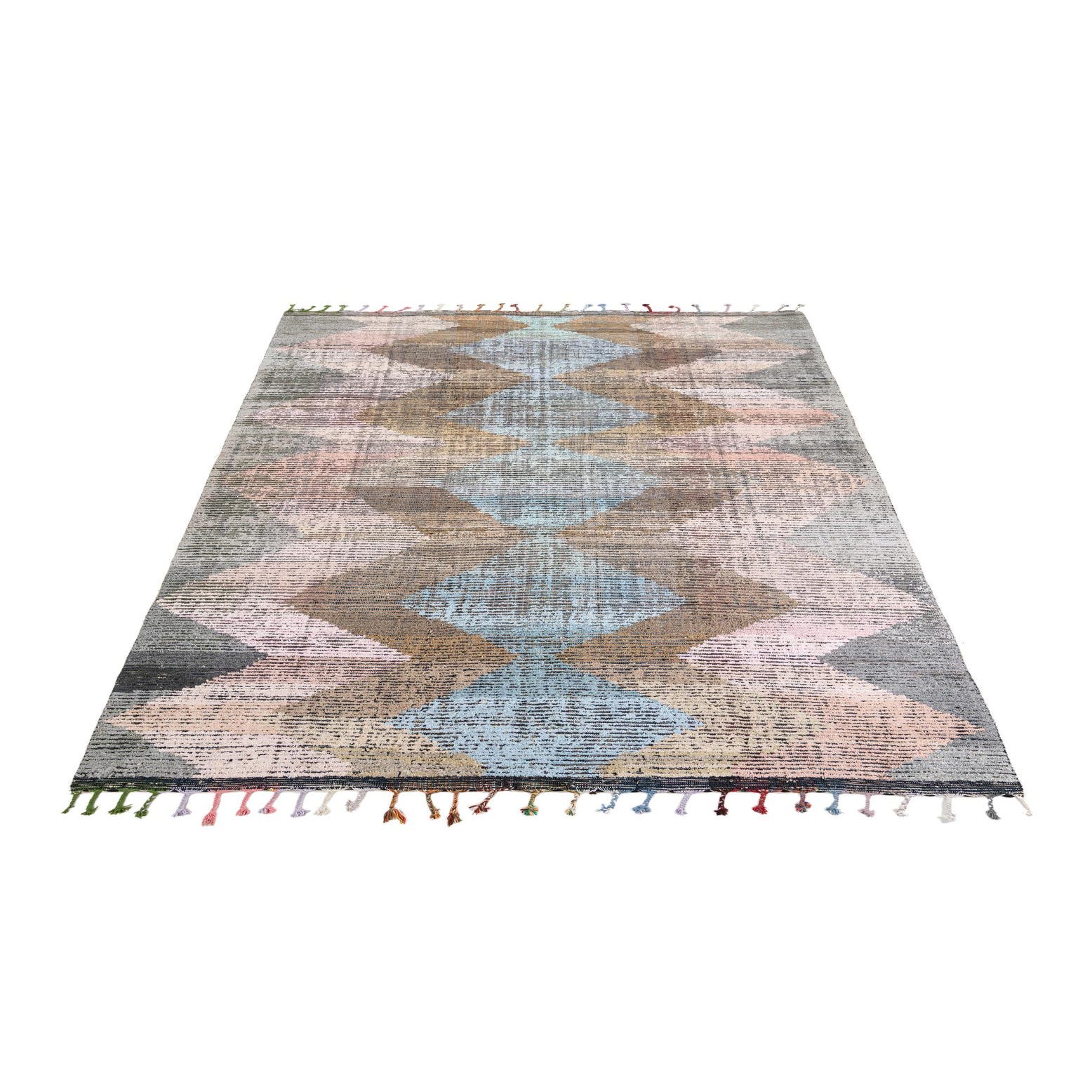 A 9x12 multi-colored rectangular wool shag rug with a modern tribal diamond pattern and colorful tassels.
