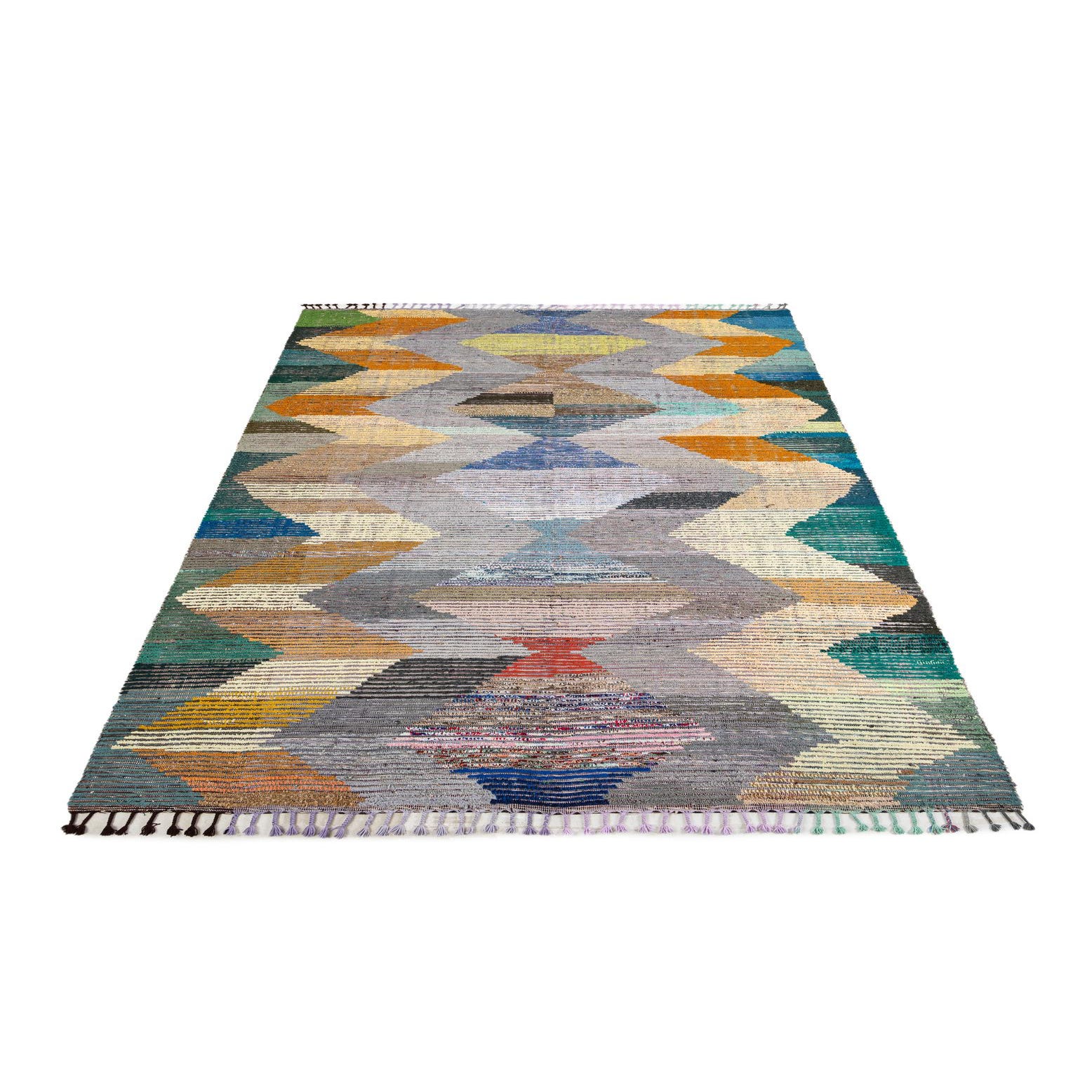 A 9x12 multi-colored rectangular wool shag rug with a modern tribal diamond pattern, ideal for a living room.