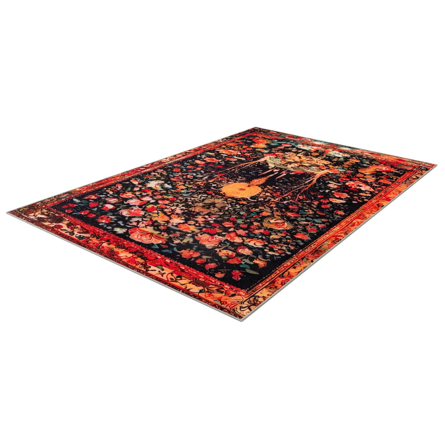Machine made of 100% chenille, the surface has a velvety, soft hand and a subtle sheen that brings out the depth of the pattern and the contrast between the dark background and the vibrant accents. Use it to anchor a seating area with jewel-toned or neutral upholstery, beneath a dining table on wood floors to add layered color, or as a focal layer in a bedroom alongside warm metallics and textured throws. The rug pairs especially well with stained wood, brass details and mixed textiles for an eclectic, collected interior.