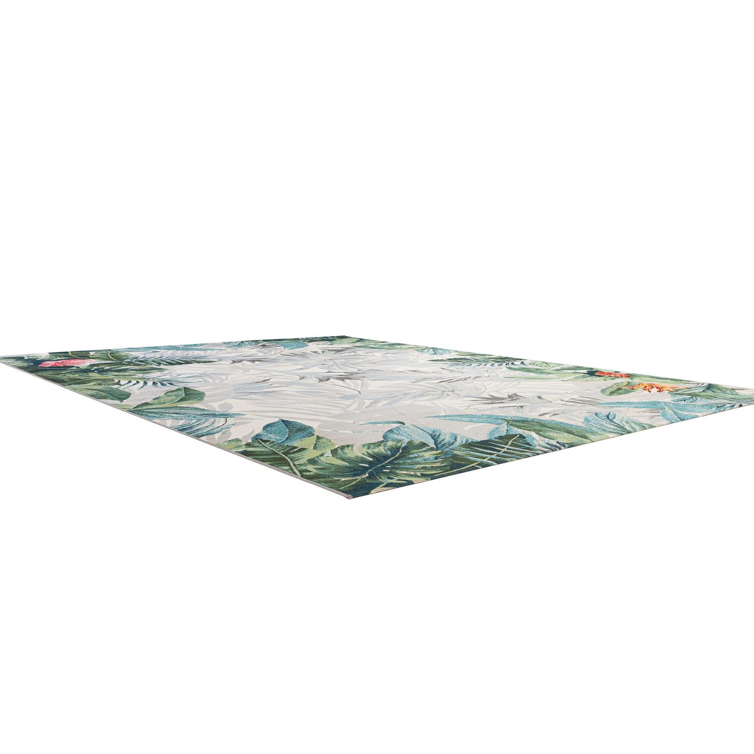 A 9x12 rectangular indoor/outdoor rug with a vibrant botanical pattern featuring large green, blue, and beige palm leaves and colorful hibiscus flowers.