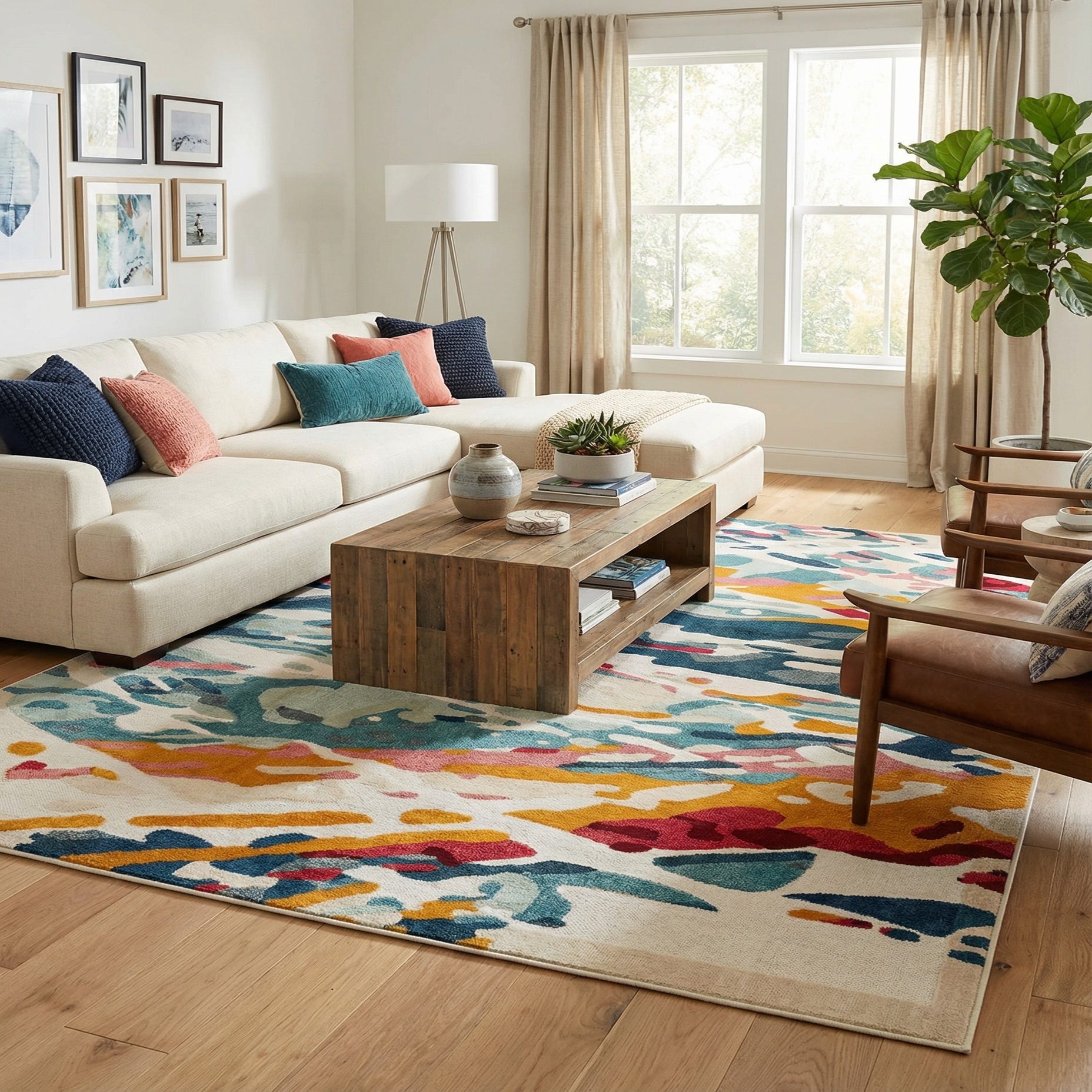 A 9x12 rectangular multi-colored modern rug with an abstract, fluid pattern in shades of blue, orange, pink, and red on a cream background.