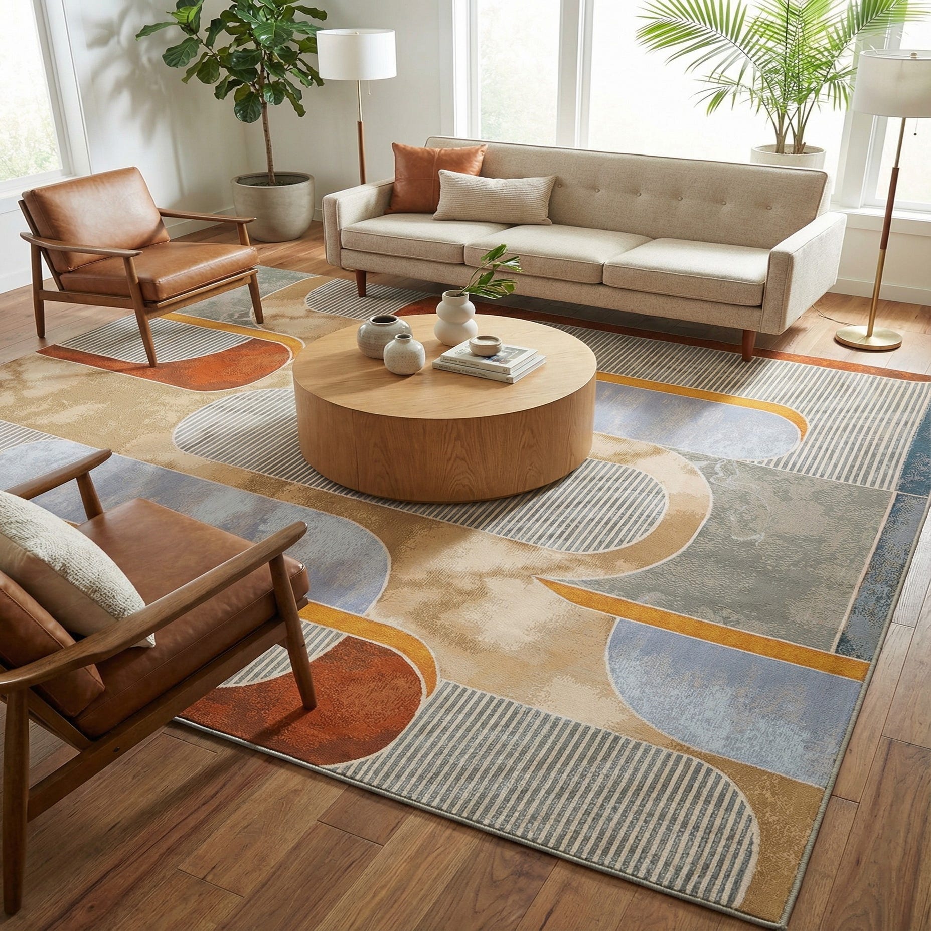 This rug pairs naturally with mid-century and contemporary furnishings—think walnut or oak sideboards, streamlined sofas, and metal or rattan accent pieces—and works equally well in covered outdoor living areas, sunrooms, or high-traffic family rooms. Use it to anchor a seating group, define a dining area, or introduce warm terracotta and cool blue-gray tones into a neutral scheme.