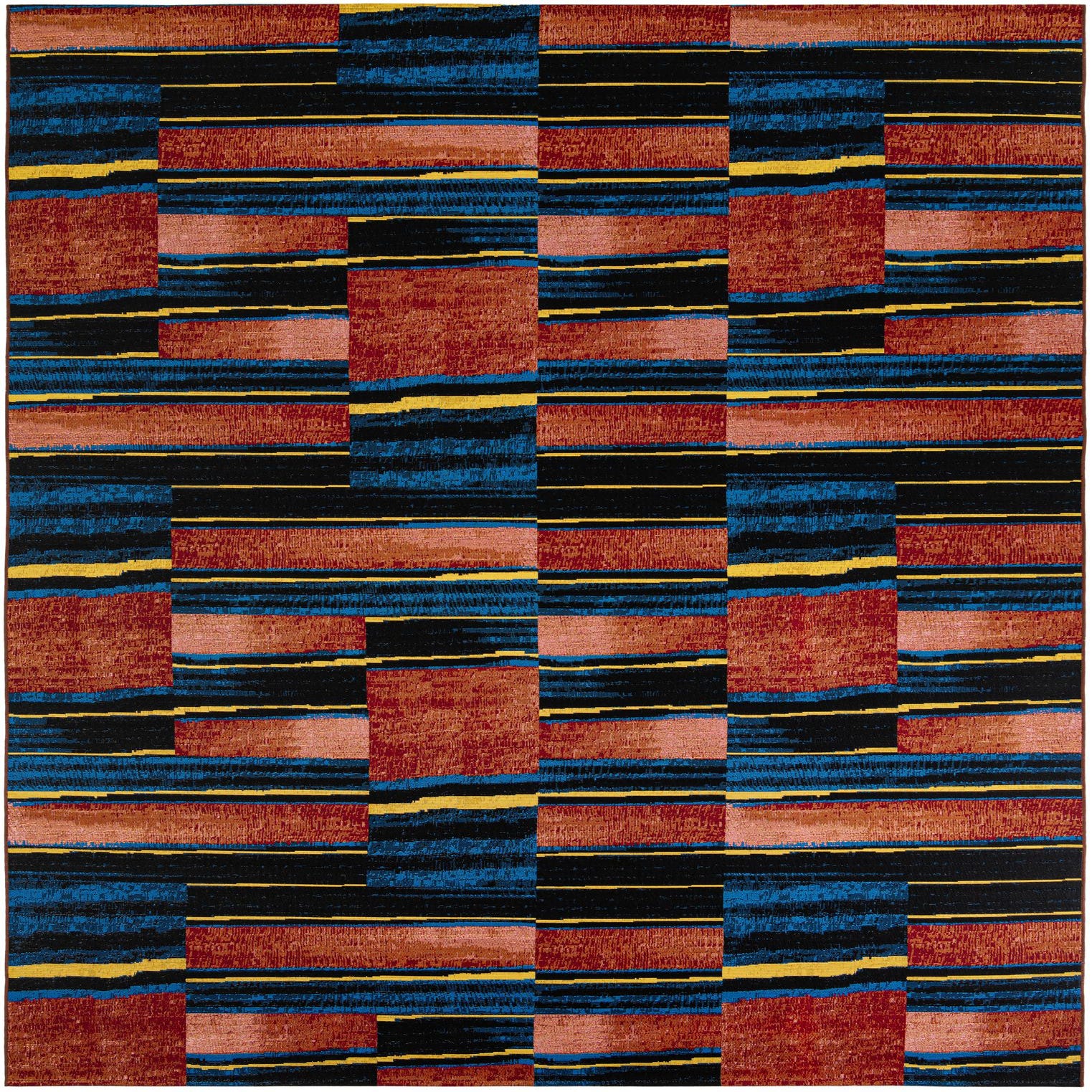 A 9x12 rectangular multi-colored rug with a modern abstract pattern of horizontal stripes and solid blocks in red, blue, black, and yellow.