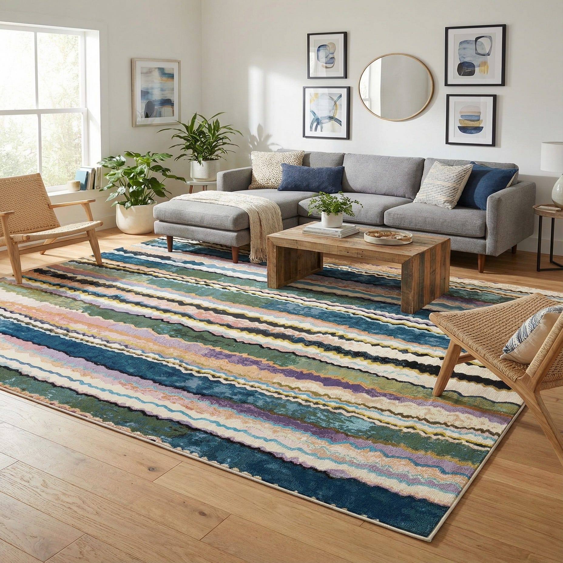 A 9x12 rectangular multi-colored modern rug featuring vertical wavy stripes in shades of blue, green, purple, pink, and yellow.