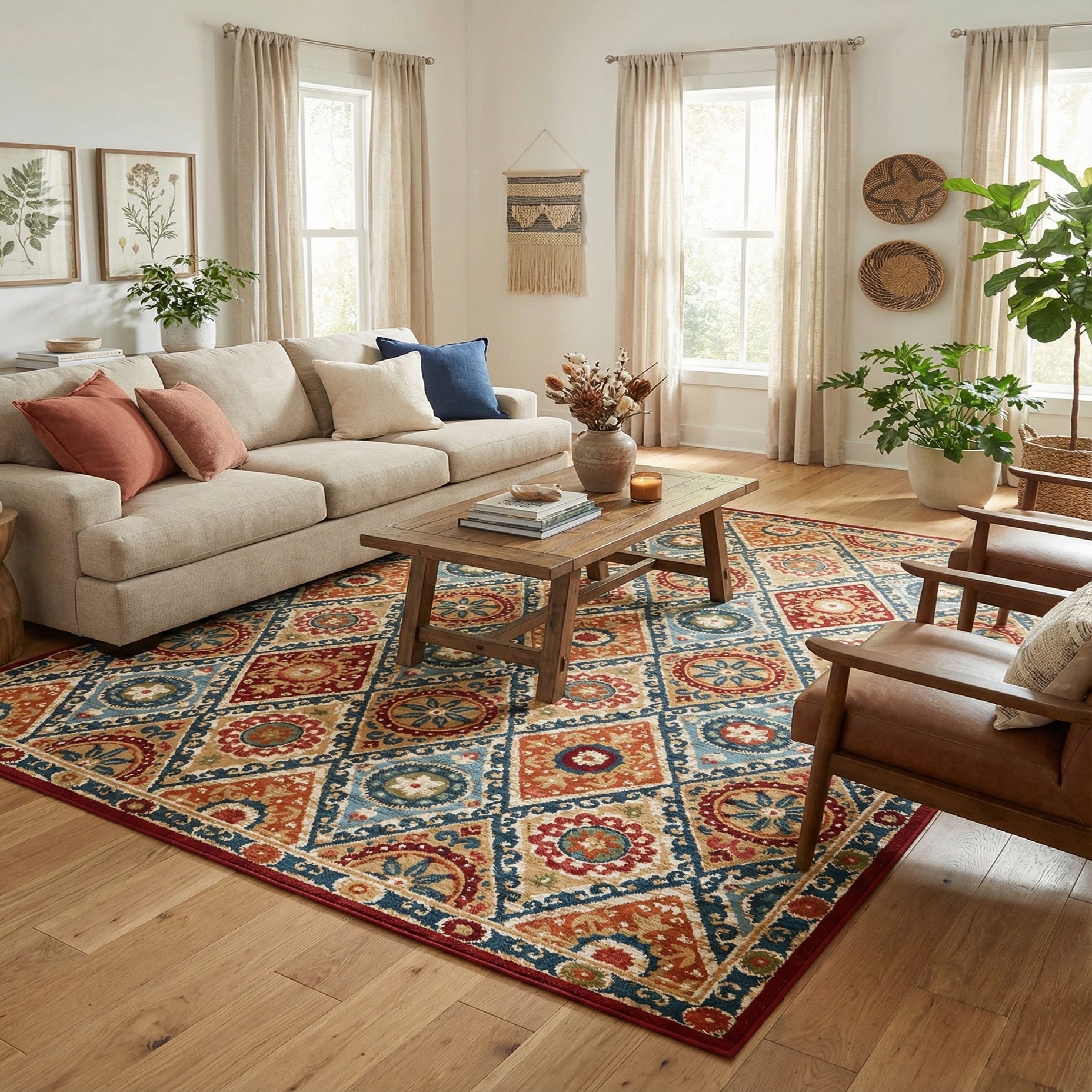 Place this rug on a covered patio or porch to bring color and pattern to an outdoor seating area, or use it indoors to anchor a casual living room or sunroom. It pairs well with warm wood furniture and woven textures, navy or ivory upholstery, and metal or rattan accents, and complements Mediterranean, bohemian, or transitional interiors. The balanced mix of warm and cool hues also makes it a strong choice under a dining table or layered over a natural fiber rug for added depth.