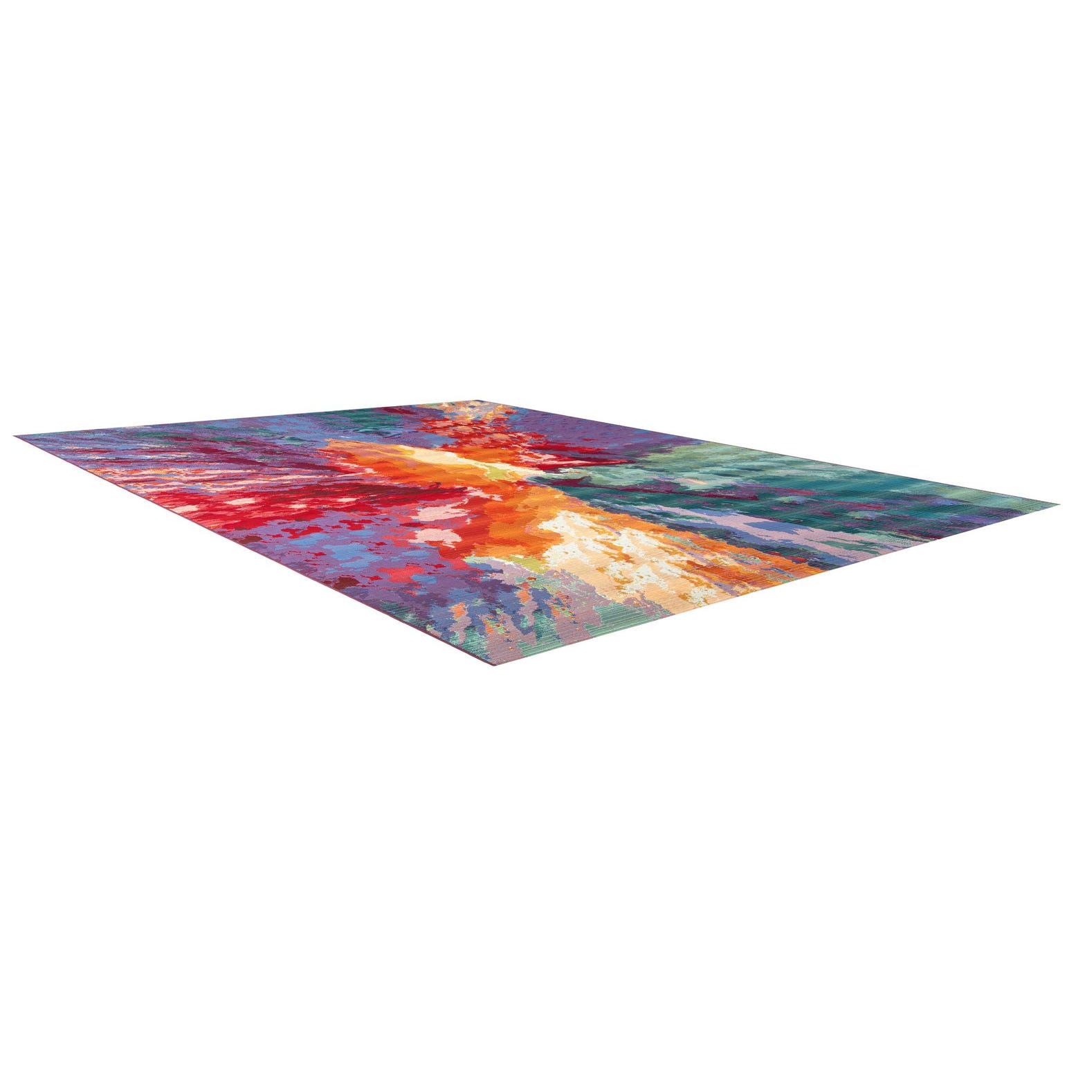 A vibrant 9x12 multi-colored abstract rug with a dynamic burst pattern, suitable for indoor or outdoor spaces.