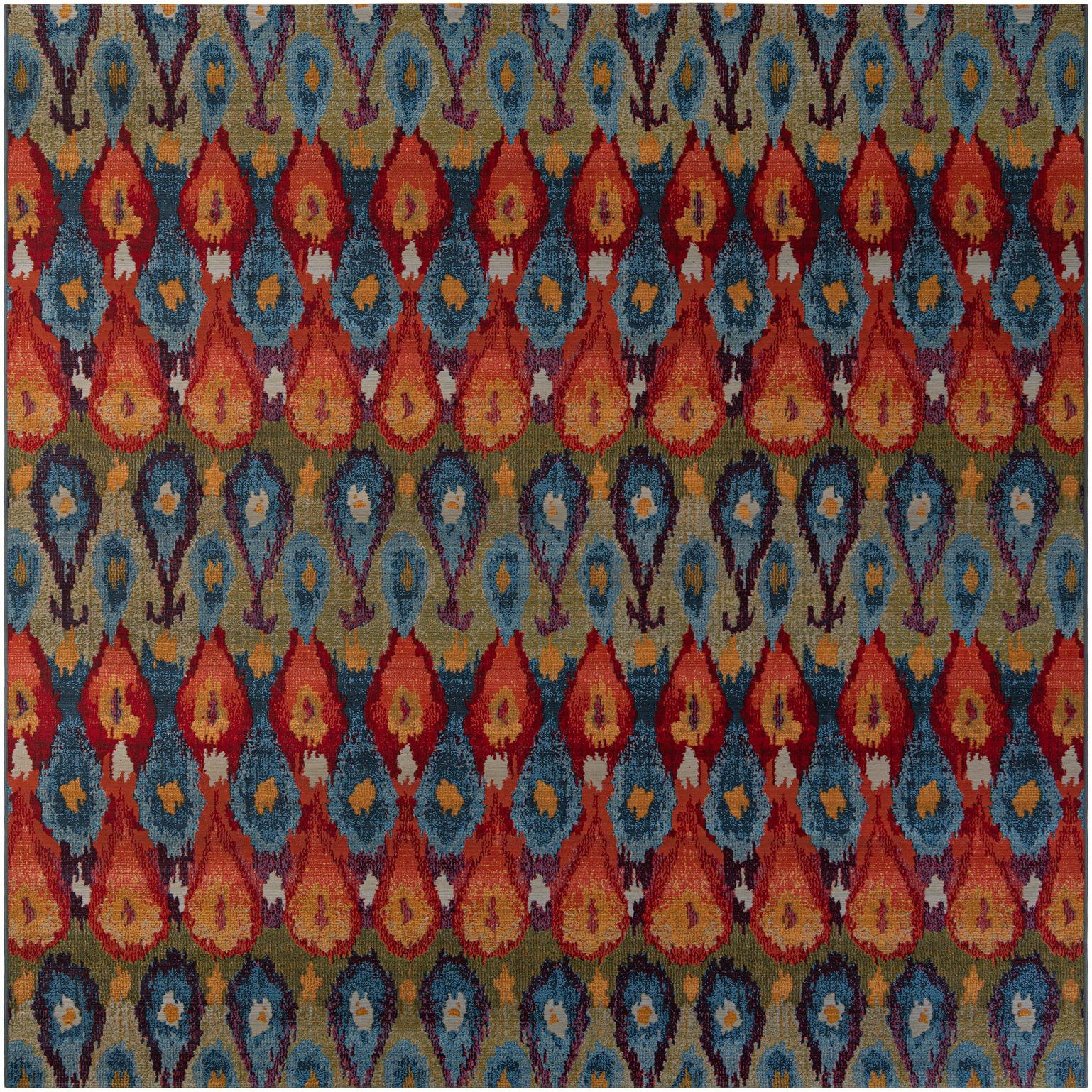 A lively, ikat-inspired pattern of elongated teardrop motifs runs in orderly horizontal bands across a multi-hued background, creating a rhythmic, painterly repeat. Rich reds and oranges sit alongside cool blues and navy, while gold and green accents add depth and warmth. The color layering gives the pattern a hand-dyed look with subtle irregular edges, bringing energy and visual texture to the floor without overwhelming a space.
