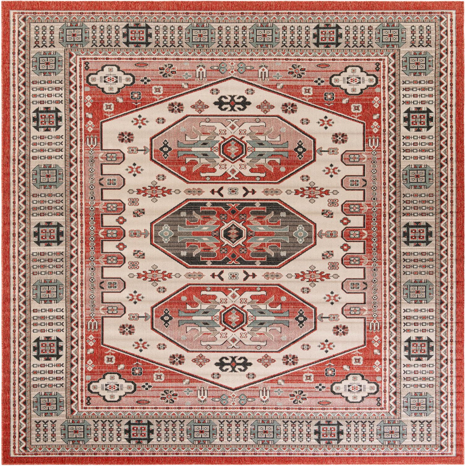 Machine-made from 100% polypropylene, the rug has a low, tightly woven pile that feels firm underfoot with a subtly brushed surface that keeps the design lines clear. Its low profile works well under furniture and in high-traffic spots. Place it on a covered patio or porch to define a seating area, under a dining table for casual indoor-outdoor meals, or in a sunroom or living room paired with warm wood furniture, rattan accents, navy or denim upholstery, and natural linens to complement the terracotta and blue tones.