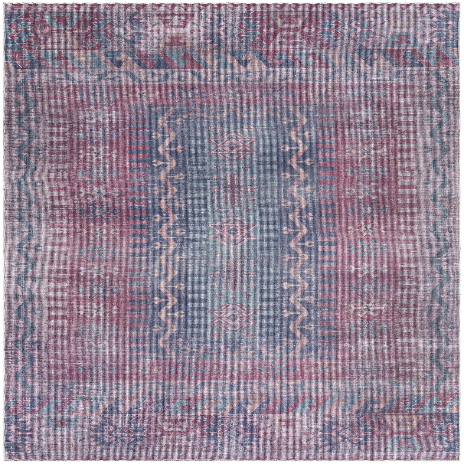 A 9x12 rectangular Sisu rug with a multi-colored traditional tribal medallion pattern in muted blues, reds, and purples, featuring a vintage distressed look.