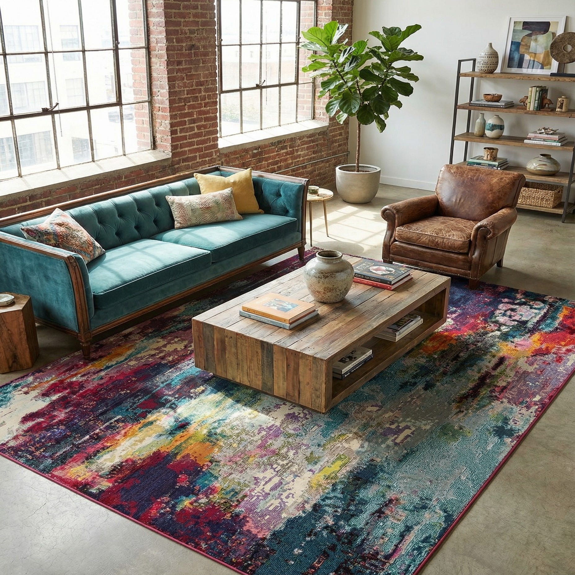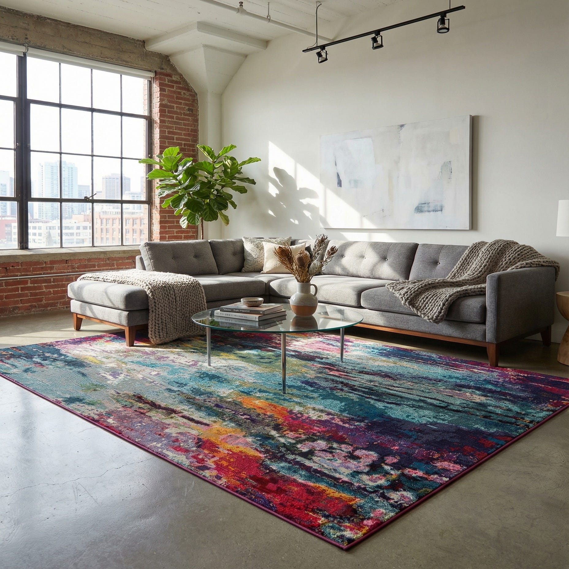This piece works well as an anchor in a modern living room—pair it with neutral sofas and minimalist furnishings to let the color story take center stage, or use it in an eclectic space with layered textiles and rich wood tones for a collected look. It also fits nicely under a dining table or in a creative studio where vibrant color and abstract pattern can energize the space.