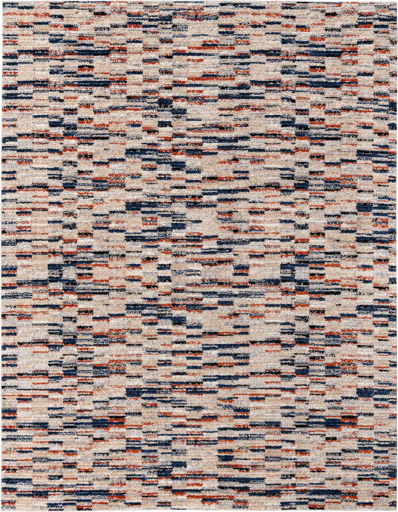 The Tucson Collection offers a 9x12 rug that boasts a diverse color palette including Multi, Beige, Black, Blue, Gray, Ivory, and Rust Red, with a background that is prominently Multi. This machine-woven rug is crafted from 100% Polyester, which ensures both durability and soft texture, creating a comfortable underfoot experience.