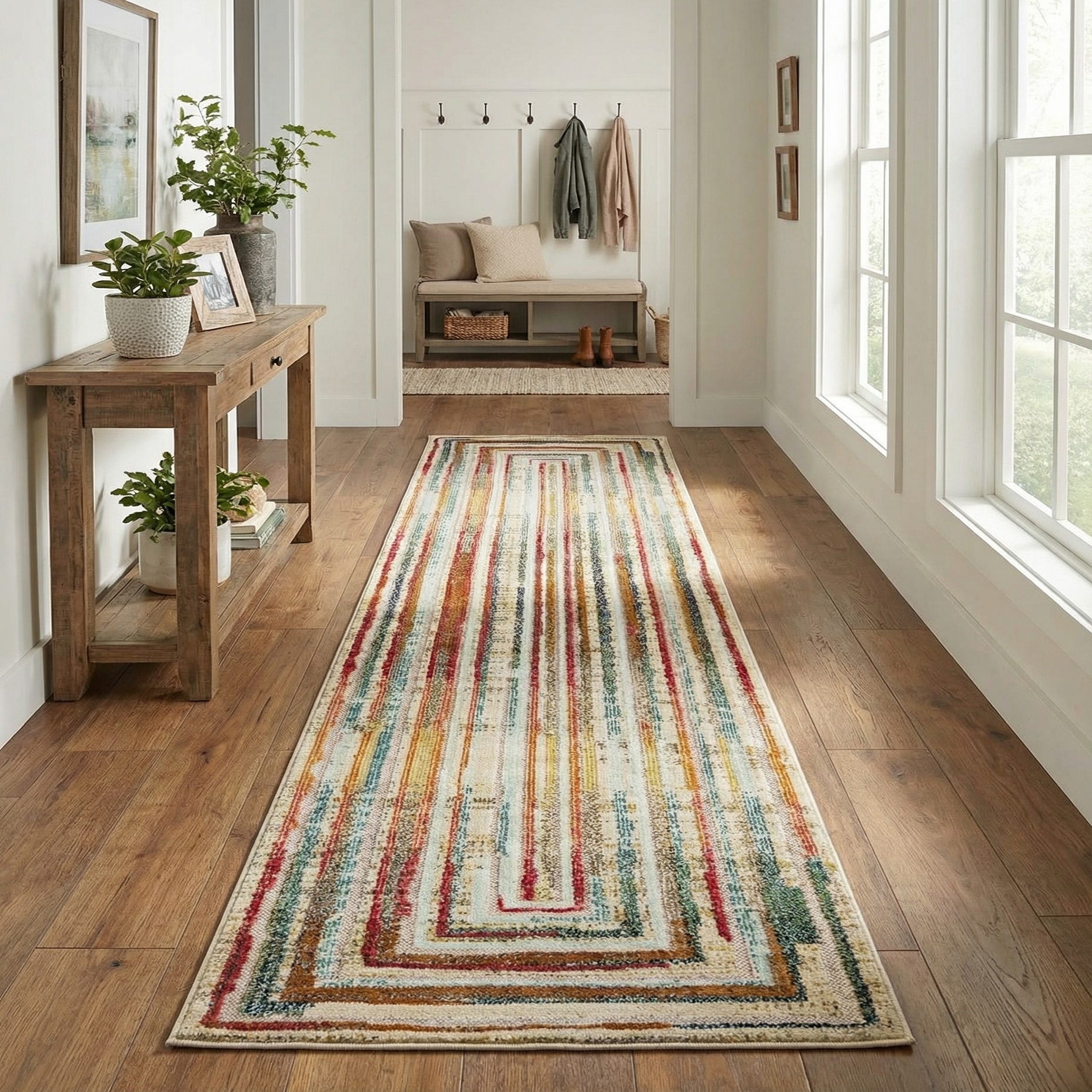 A 12 ft runner rug with a modern multi-beige pattern featuring textured vertical stripes in various colors like red, blue, green, and orange.