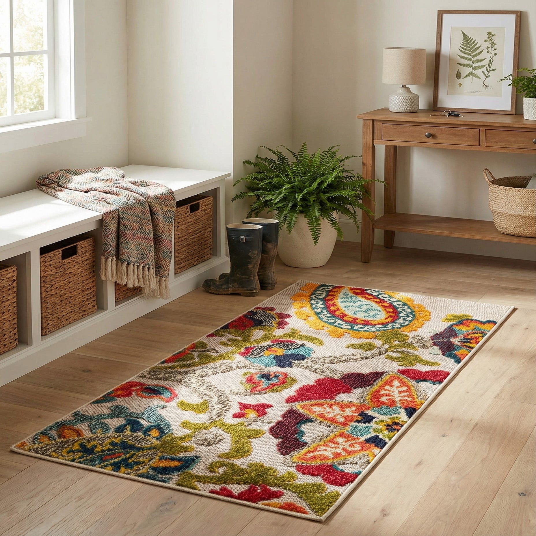 A 2x3 rectangular Rugs.com Outdoor Casablanca rug featuring a vibrant multi-beige modern floral and paisley pattern.