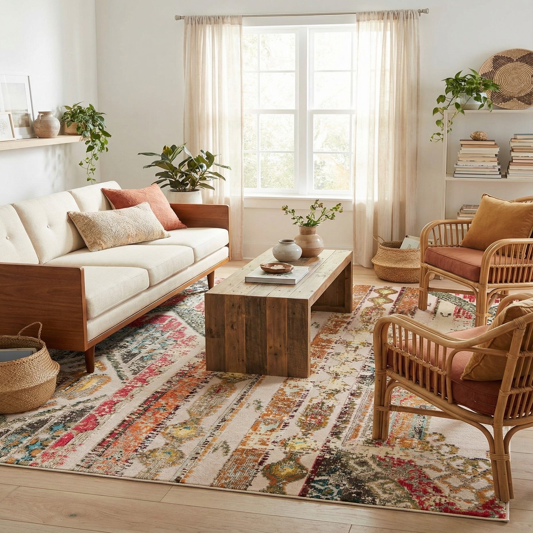 Machine made of 100% polypropylene, the rug has a tightly woven, slightly textured surface that holds its shape under furniture and feels smooth underfoot. It works well on a covered patio or sunroom as an outdoor-friendly anchor, or indoors beneath a coffee table, at the foot of a bed, or in an entry where pattern and color can make a welcoming statement. Pair it with natural materials like rattan, jute or weathered wood, neutral upholstery to let the colors pop, or layered into a bohemian, eclectic, or transitional scheme for added visual interest.