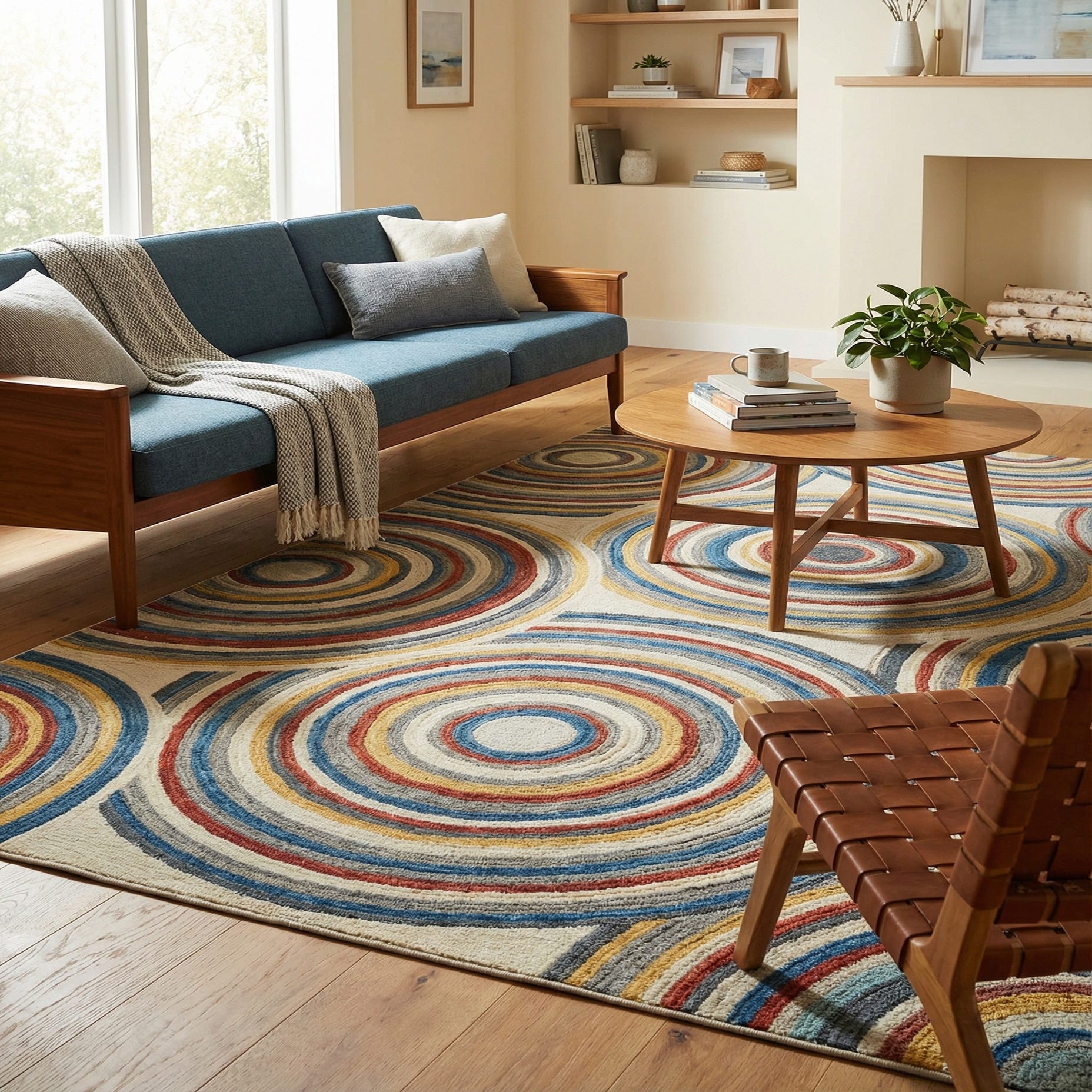 A vibrant 8x10 rectangular rug featuring a modern, multi-color concentric circle pattern on a light beige background, suitable for indoor or outdoor spaces.