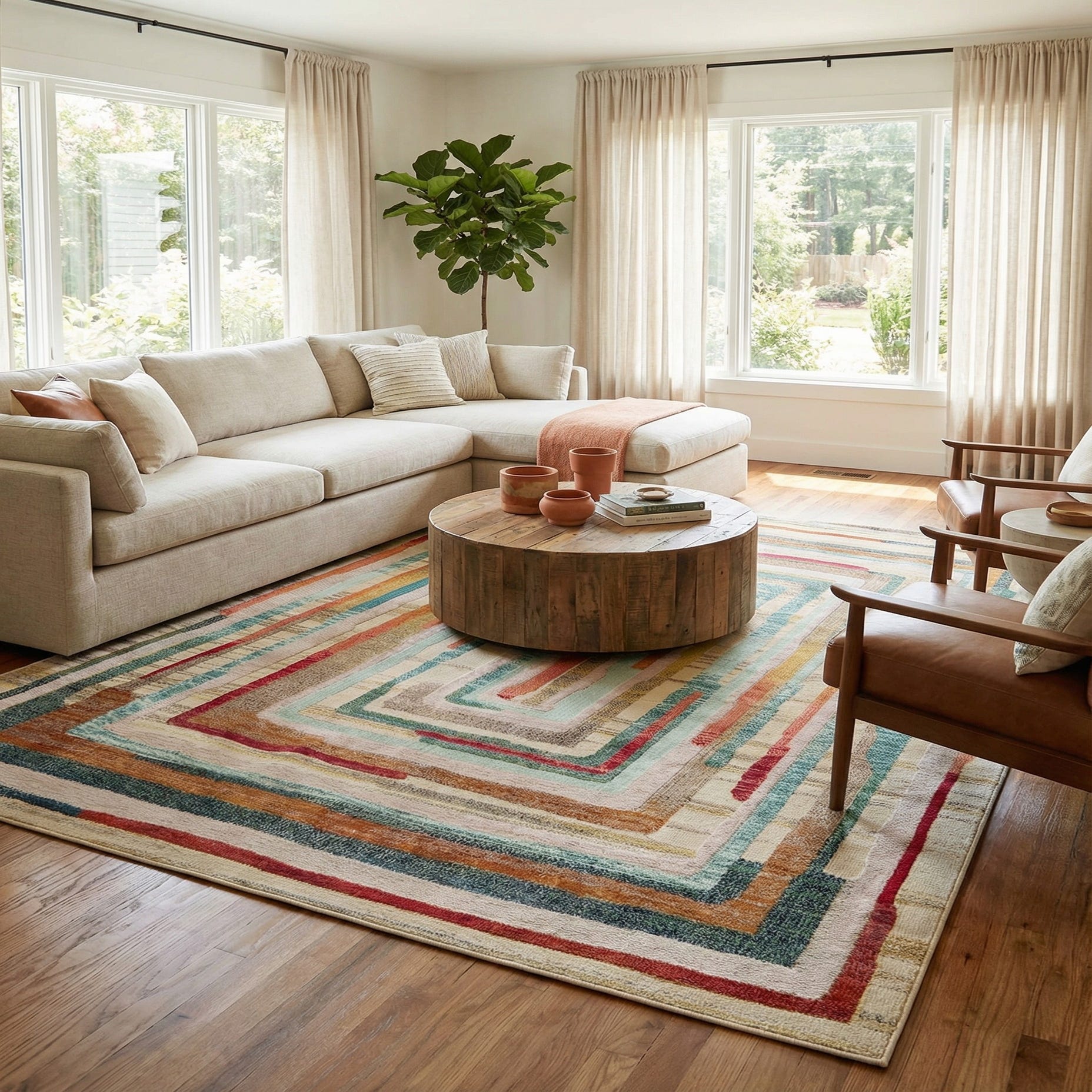 This piece works well on covered patios, sunrooms, or a casual living and dining area where color and pattern can anchor the room. Pair it with warm wood furniture and neutral upholstery to let the rug’s colors pop, or use it with mid-century modern pieces and brass accents for a more graphic, collected look. Its balanced palette and sculptural pattern also layer nicely over natural-fiber rugs for added interest in larger spaces.