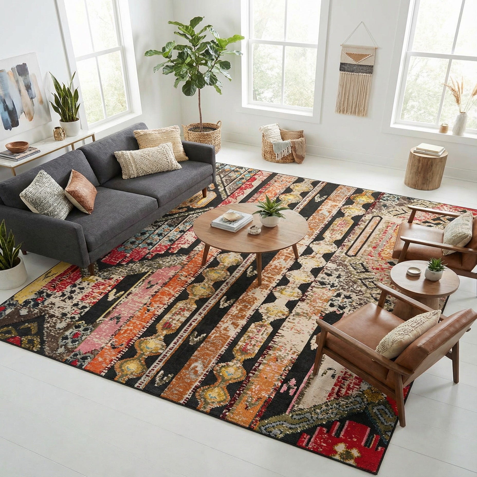 Primary color is Multi Black. Colors in this rug include: Multi Black, Beige, Blue, Green, Light Green, Ivory, Red, Yellow, Orange.
