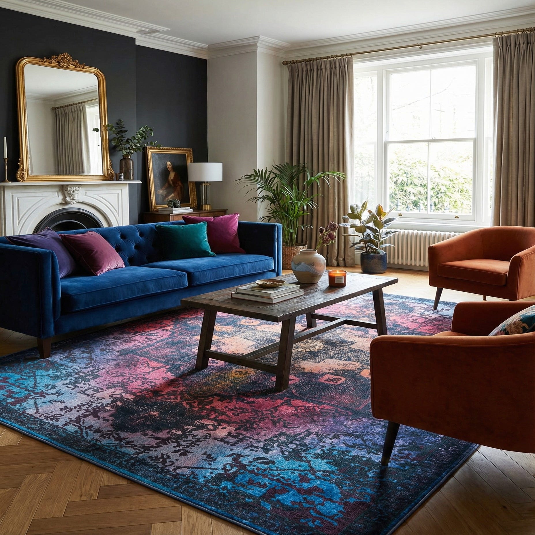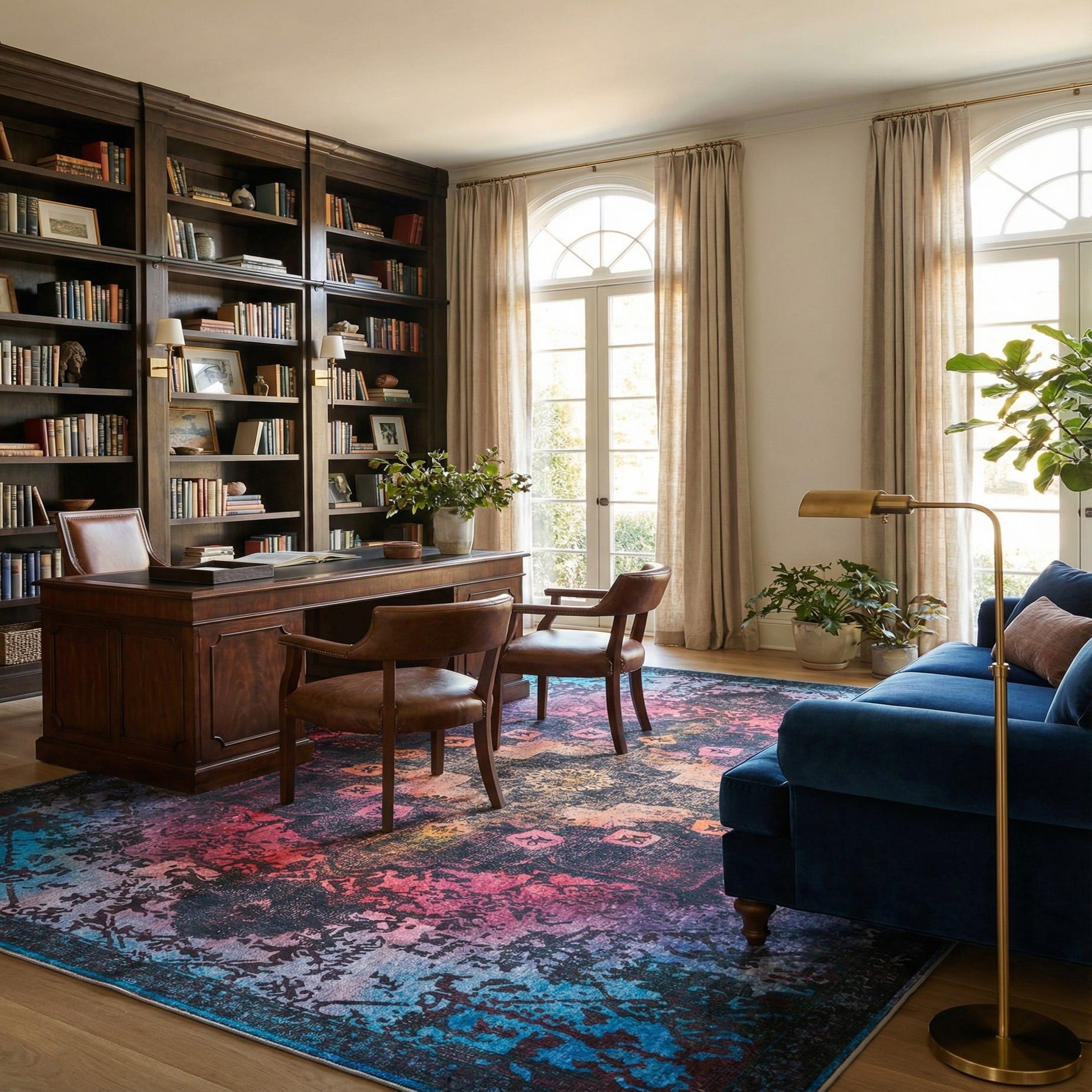 Machine made of polyester chenille, the surface has a soft, velvety hand and a low, plush pile that feels smooth underfoot. The chenille yarns catch light subtly, adding depth to the color shifts without heavy sheen. Use this piece as a living room anchor beneath a sofa and coffee table, layered at the end of a bed for added warmth and color, or to bring personality to a home office or creative loft. It pairs well with neutral upholstery and warm woods, or with matte black metal accents and other jewel-toned accessories for a bold, curated look.