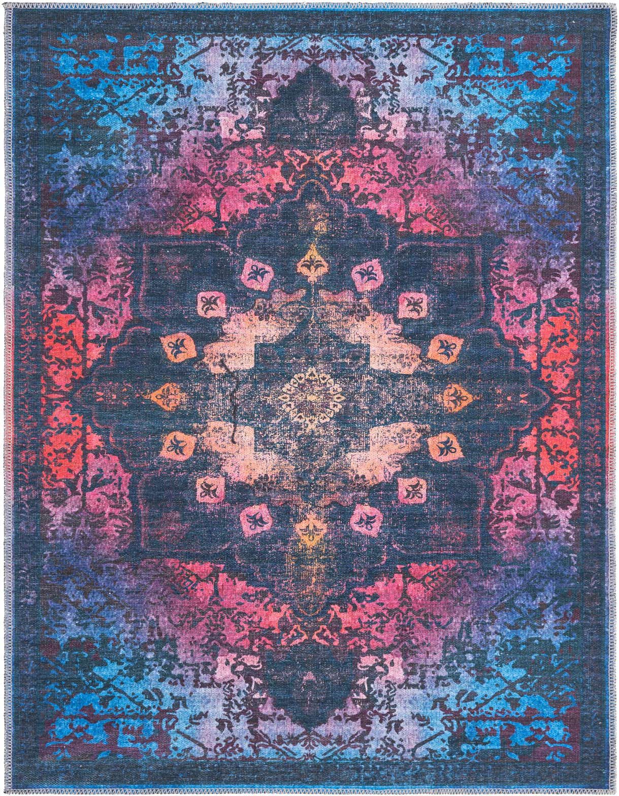 Primary color is Multi Black. Colors in this rug include: Multi Black, Black, Blue, Light Blue, Red, Violet, Orange, Pink.