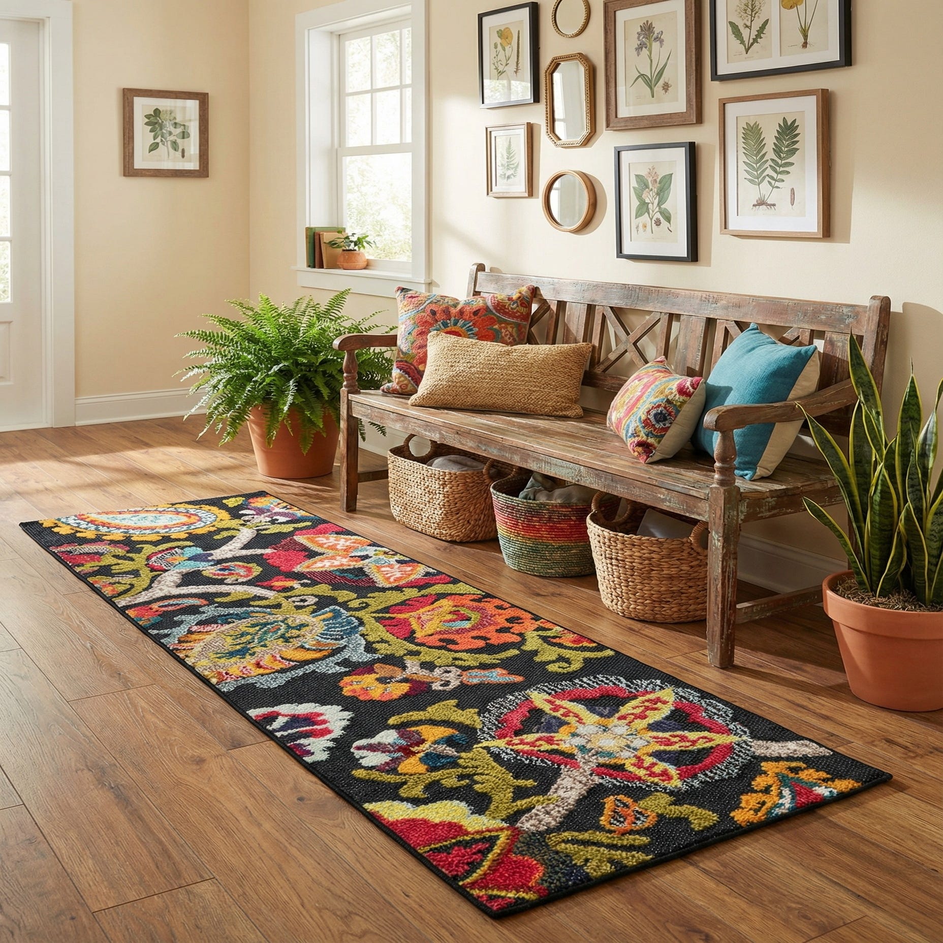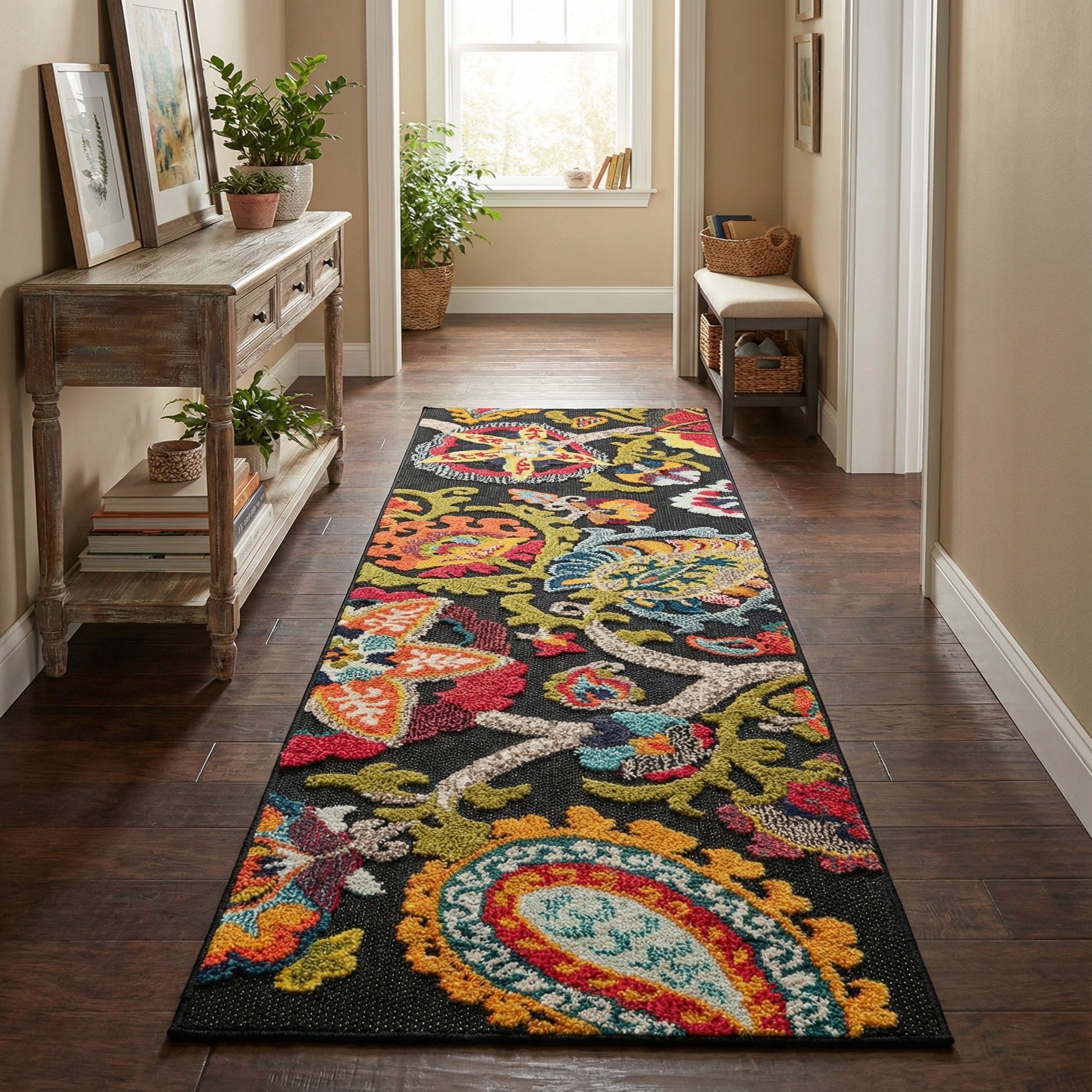 A 6 ft runner rug with a black background and a vibrant, multi-colored modern floral and paisley pattern, suitable for a hallway or patio.