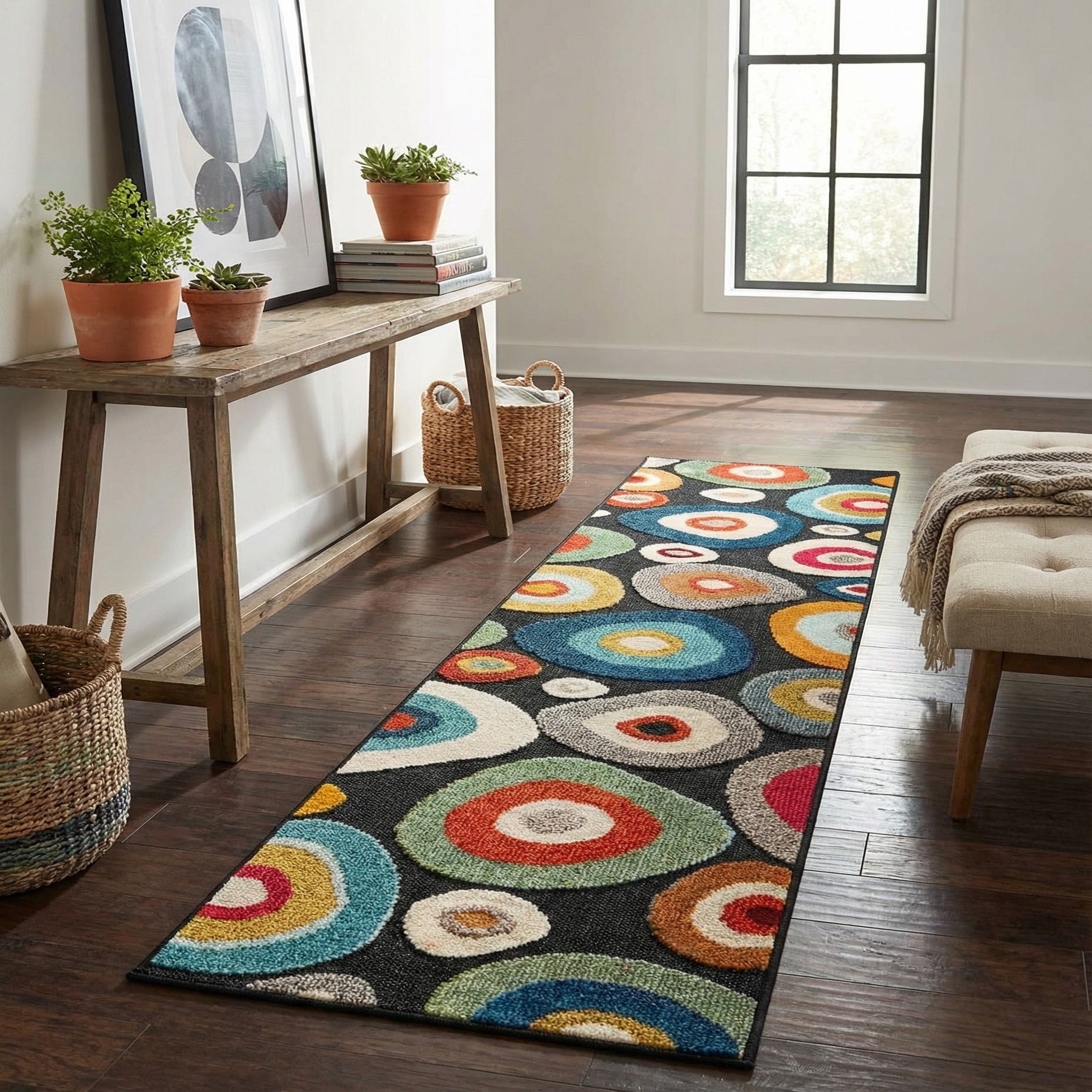 A black 8 ft runner rug with a modern pattern of large, multi-colored concentric circles in blues, oranges, greens, and reds, suitable for a hallway or patio.