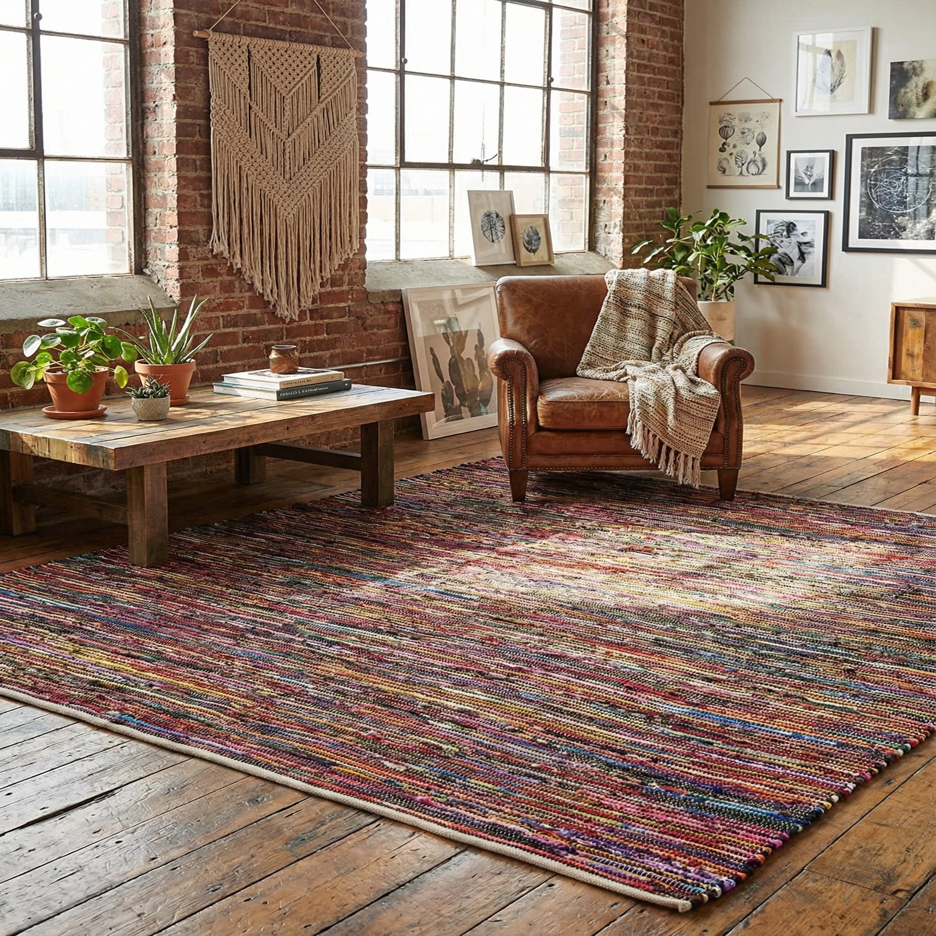 The texture is low-profile and tactile: firm underfoot with a slightly nubby, woven hand that invites touching but stays flat beneath furniture. It pairs easily with warm wood tones, leather seating and metal accents, and brings color without dominating a room. Ideal for a cozy living area layered under a coffee table, a lively dining nook where chairs can glide across the surface, or an entryway that benefits from a durable, stylish statement; it also complements eclectic, bohemian, modern farmhouse and casual contemporary interiors.