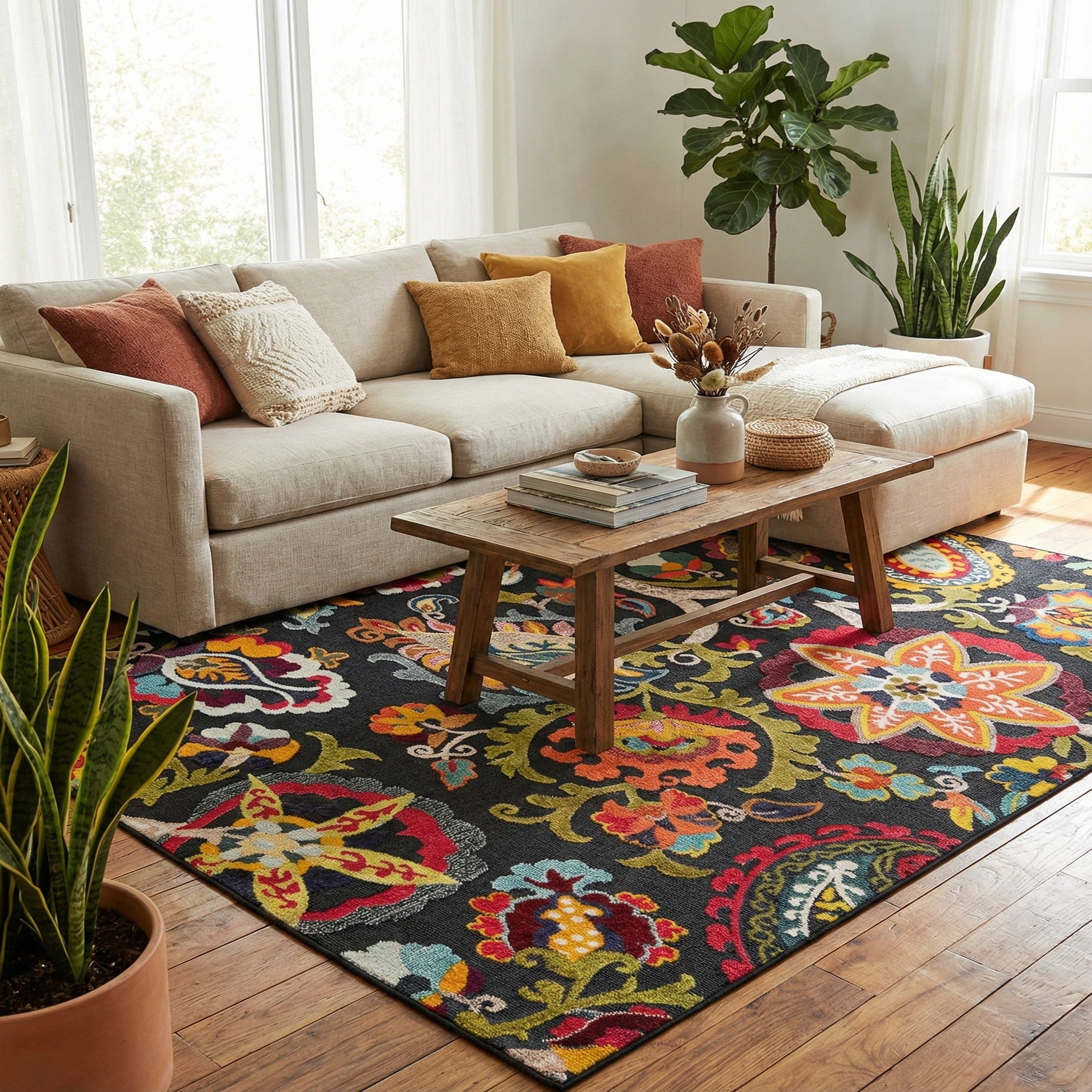 Primary color is Multi Black. Colors in this rug include: Multi Black, Beige, Blue, Burgundy, Hunter Green, Ivory, Yellow, Orange, Olive.