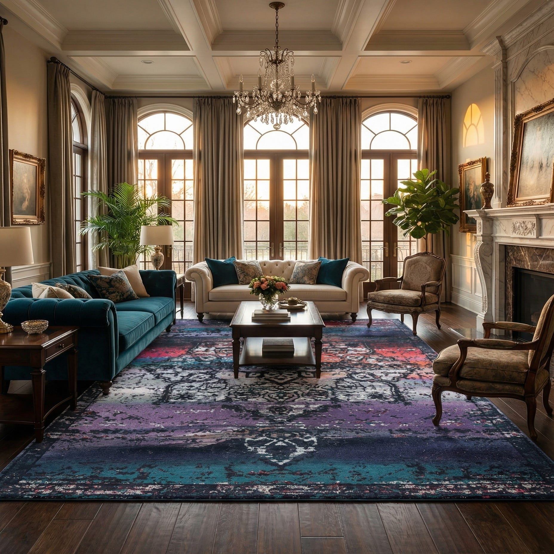 Run your hand across the rug and you’ll feel the plush chenille that cushions bare feet while maintaining clear pattern detail from a distance. Its bold yet artful color story works well as an anchor in a modern living room with neutral seating, as a vibrant base in a bohemian bedroom layered with textiles, or as a focal point under a dining table paired with warm wood tones and matte metal accents. It also pairs nicely with mid-century and eclectic décor where color and texture are central design elements.