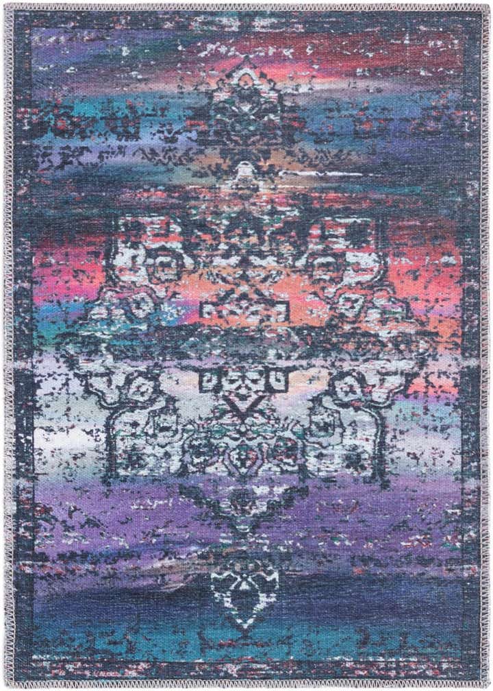 This rug comes in many different colors. I chose black but the black is very subtle as a background color. There's purples reds blues and the medallion in the middle is a faded orange color like sandstone. The colors blend into each other and are just beautiful! The rug isn't a pile rug. It's flat. I love that because I have animals and it's easy to clean! Overall rugs.com had the best prices selection customer service and quality brands! Check them out when rug shopping. The rugs arrive in about 2 weeks!