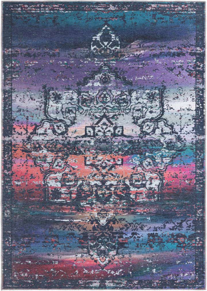 Primary color is Multi Blue. Colors in this rug include: Multi Blue, Black, Blue, Ivory, Violet, Orange, Red.