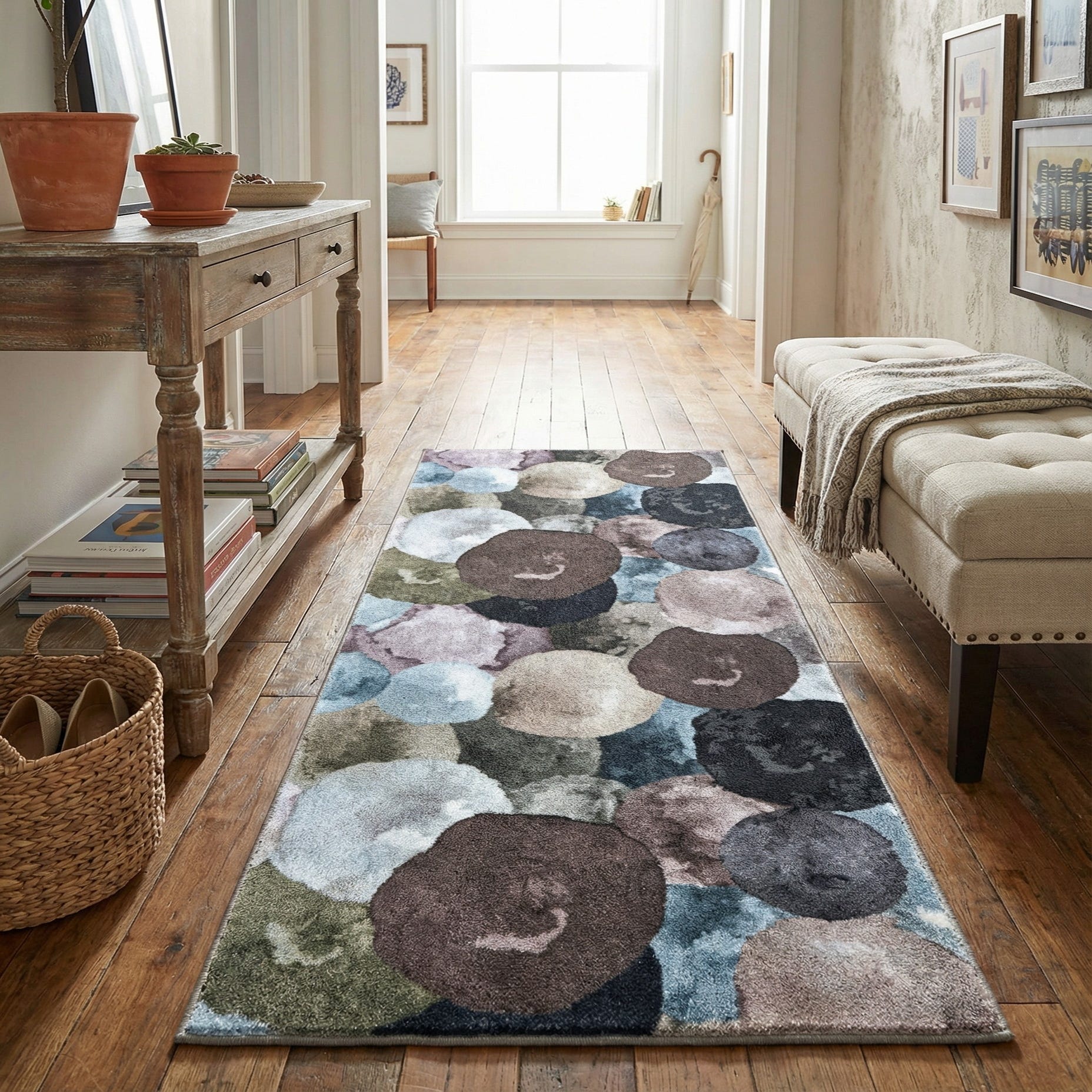This runner works well in a narrow entry, hallway, or kitchen galley where you want a touch of pattern without overpowering the space. Pair it with warm wood floors and leather or neutral upholstery to bring out the brown and beige tones, or use it to introduce soft blues and grays into a contemporary living area or bedroom. Its mix of cool and warm hues also complements transitional and mid-century modern schemes, and it layers nicely over hardwood or tile to add visual interest and a welcoming texture.