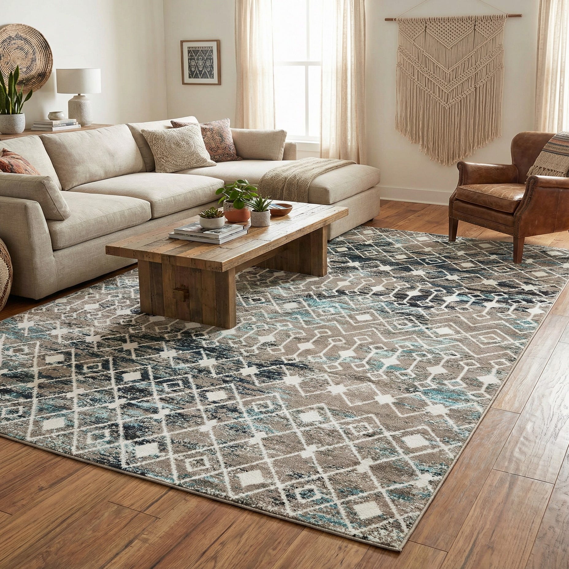 The Moroccan Trellis collection rug offers a modern take on a classic geometric pattern featuring a lattice design that is both contemporary and transitional. Machine-woven of polypropylene, this 9x12 area rug presents a durable and easy-to-clean surface suited for high-traffic areas. Its color palette, comprised of Multi Gray Blue, Ivory, and Beige, provides a versatile foundation for various interior design themes.