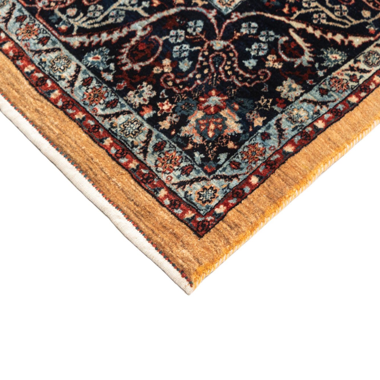 A rectangular, multi-colored Persian wool rug featuring a central field of interlocking floral medallions in rust, blue, and peach on a gold background, framed by an intricate navy and light blue border.