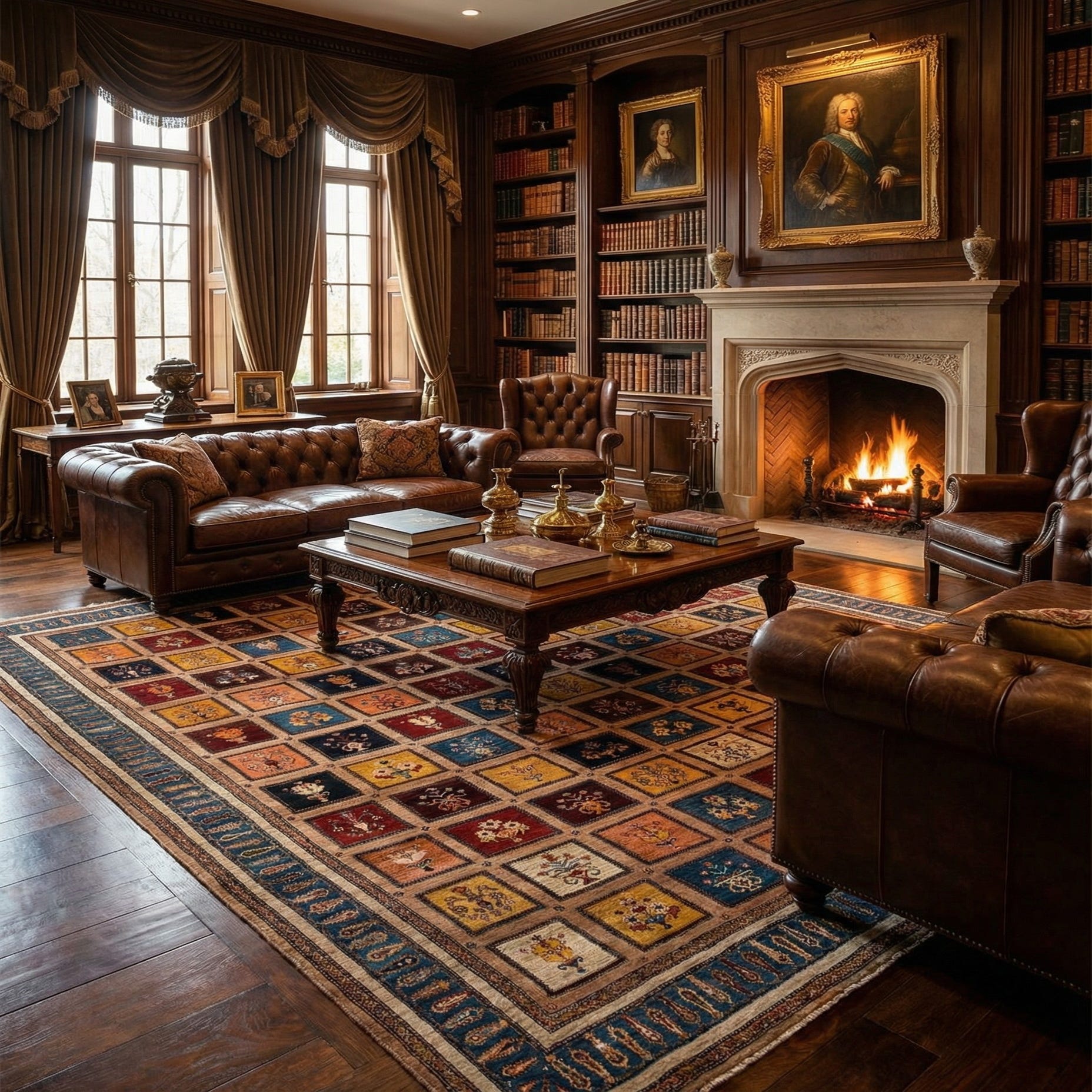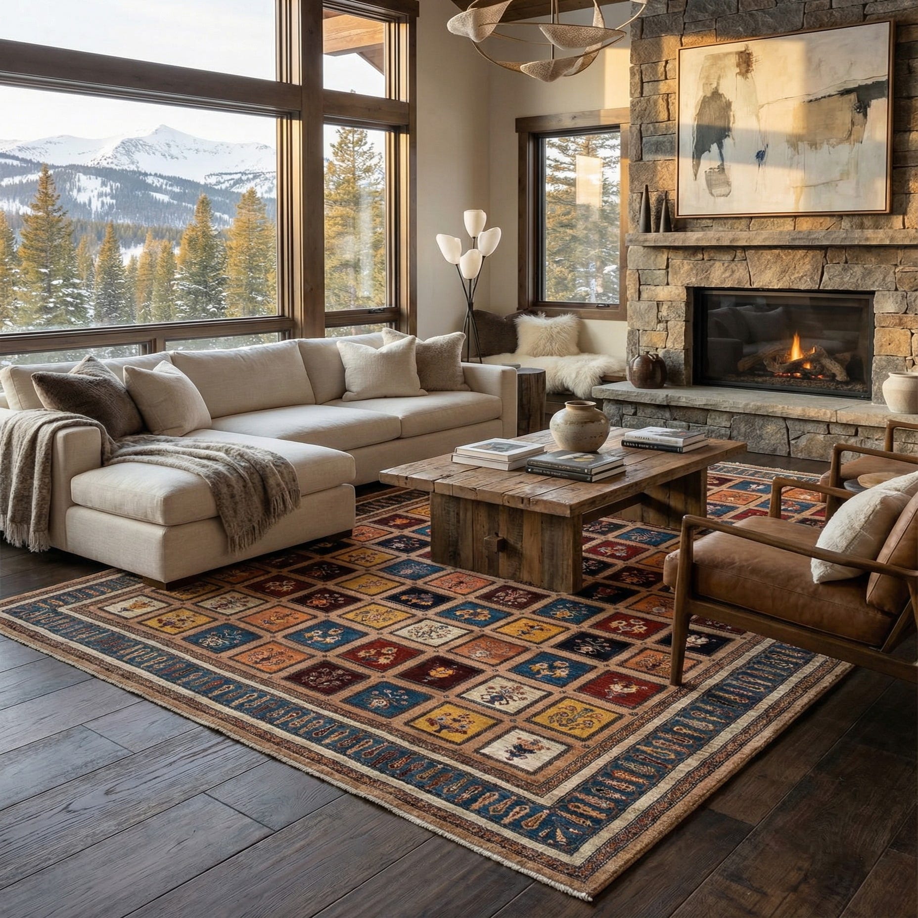 A rectangular, multi-colored Persian wool rug with a grid of floral motifs in various hues, framed by a blue border.