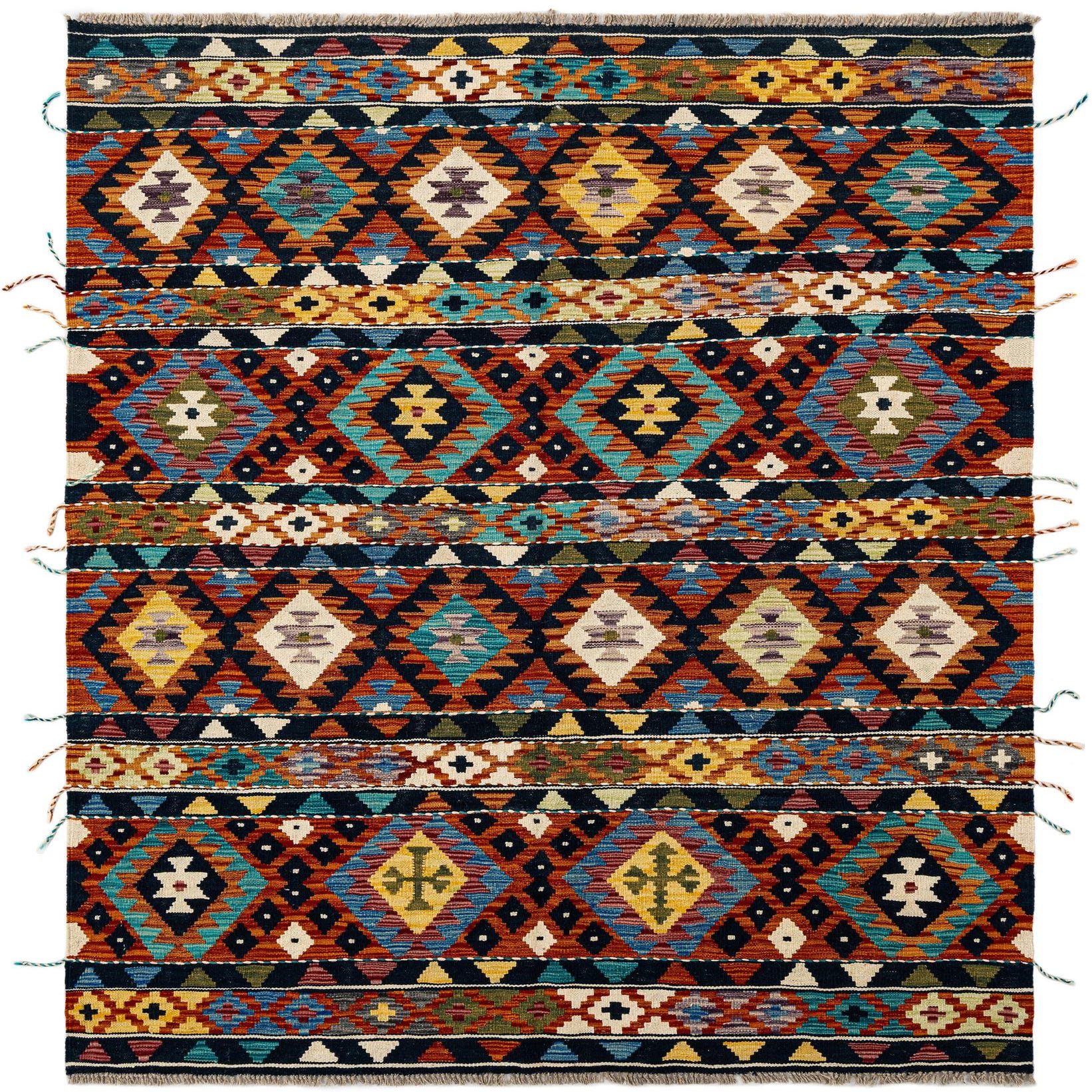 A vibrant, multi-colored rectangular Marok Kilim rug with intricate Persian tribal patterns and diamond motifs.