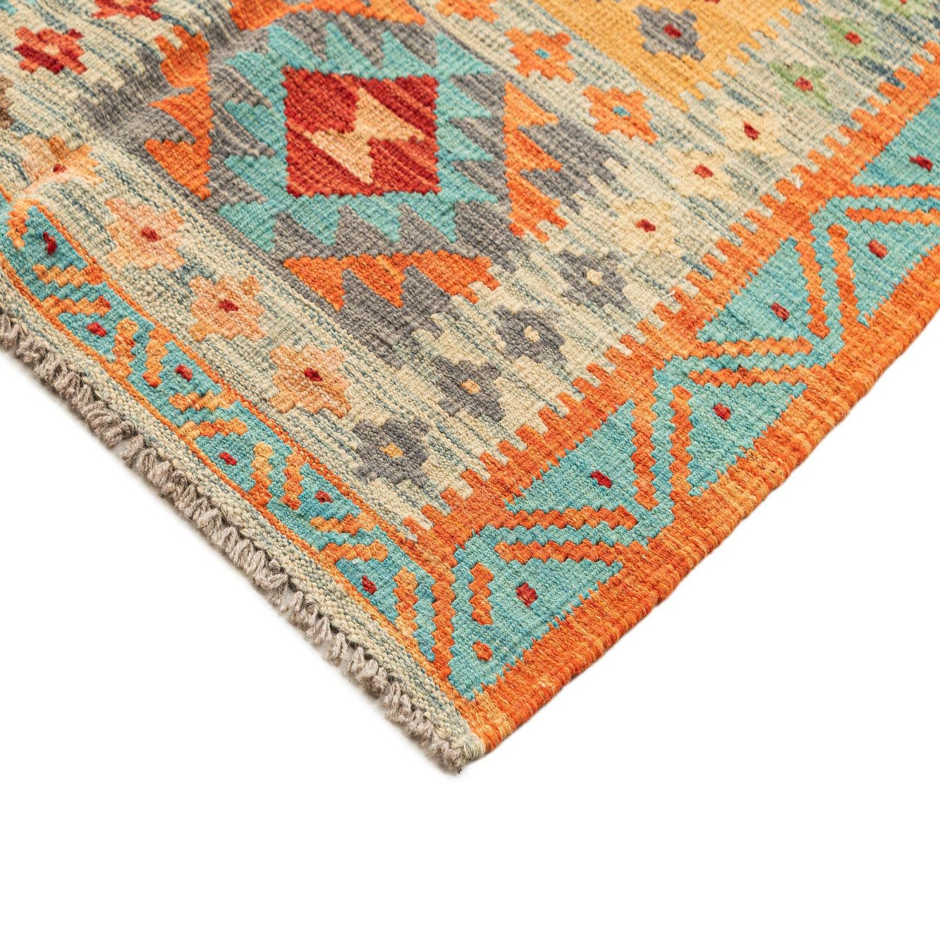 Hand-knotted in wool and fully handmade, this rug displays a grid of rectangular kilim panels that celebrate geometric and tribal motifs. Each panel is defined by crisp diamonds, stylized florals, hooked lozenges and stepped borders, creating a lively patchwork across the multicolored ground. The palette mixes warm rusts and terracotta with mustard gold, turquoise and teal, balanced by cream, sage and earthy brown tones, giving the design both warmth and visual depth. The tightly knotted wool surface has a textured, tactile quality with subtle variations in yarn and color that read clearly across the pattern.