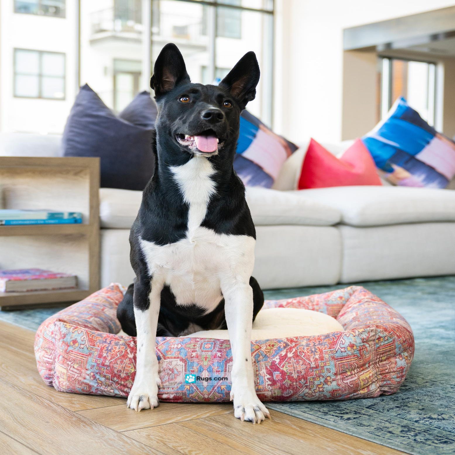A black and white dog sits in a multi-colored rectangular pet bed with a vibrant, intricate pattern, on a light wood floor next to a blue area rug.