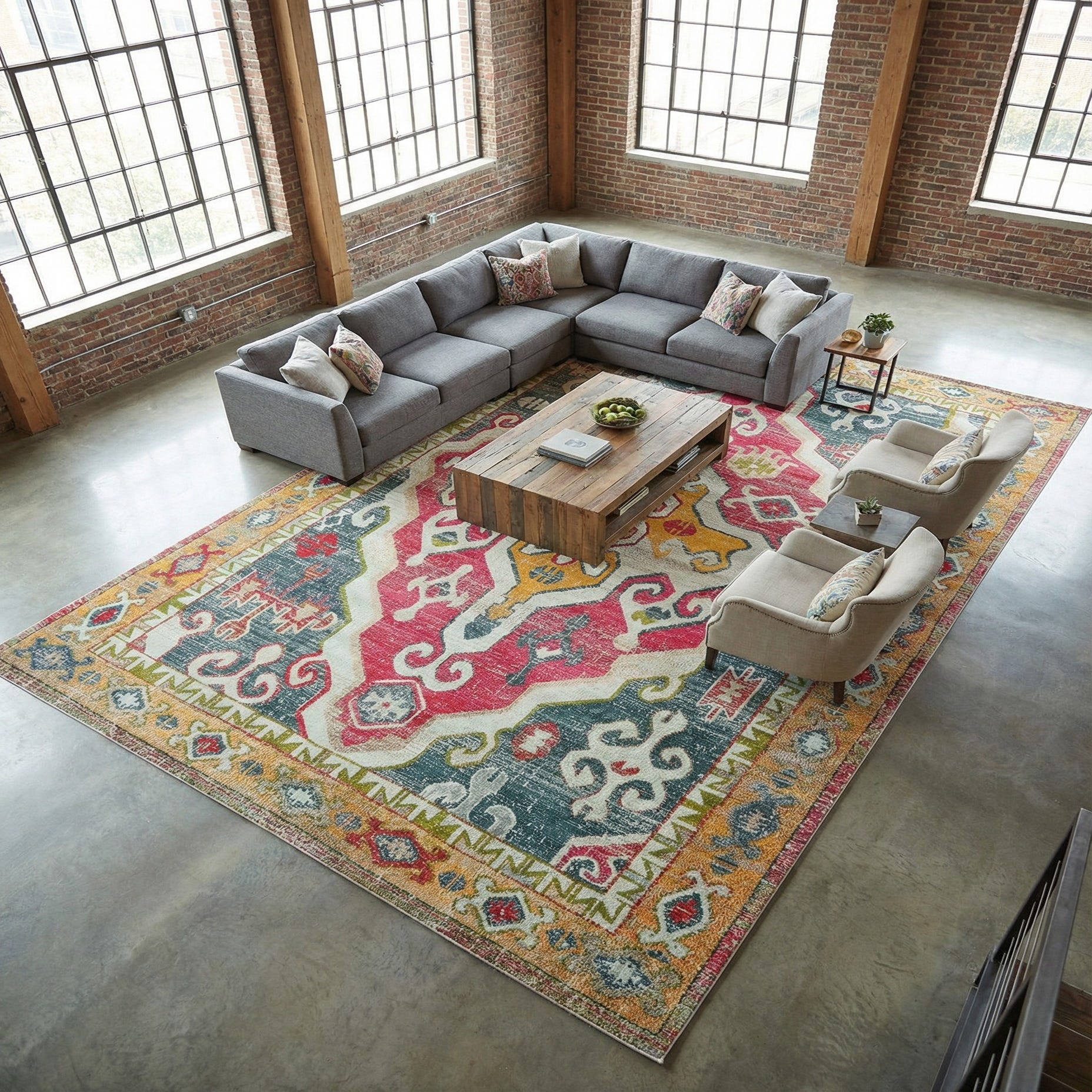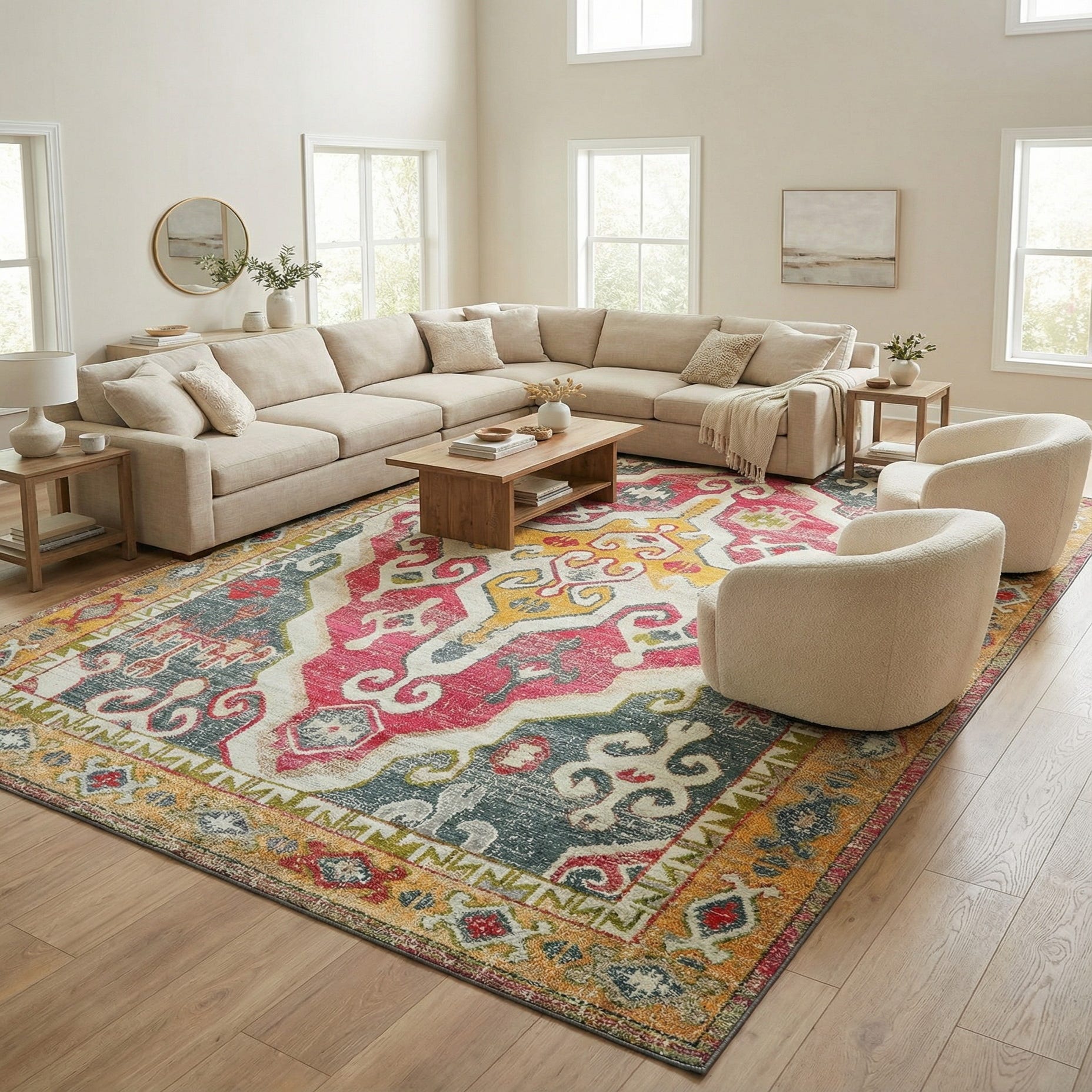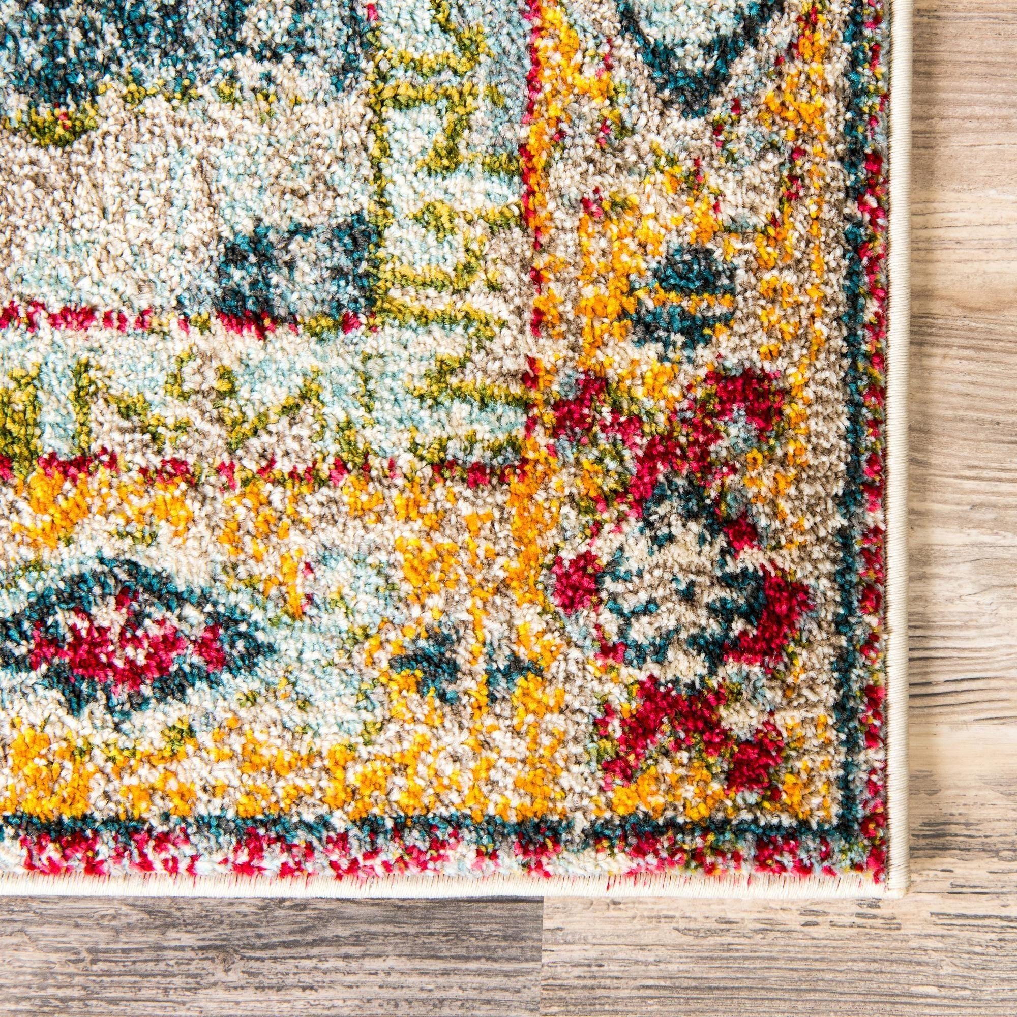This Palace Rugs piece is machine made from 100% polypropylene and has a low-profile, slightly dense hand that lies smooth underfoot. The texture and color palette make it versatile for everyday use—place it beneath a sofa and coffee table to anchor a living room seating area, under a dining table to add color and pattern without excess pile, or in an entryway to create a strong first impression. Pair with warm wood furniture and neutral upholstery for a balanced look, layer with woven textures and plants in a bohemian or eclectic scheme, or use it to introduce color accents like navy or light blue in a transitional space.