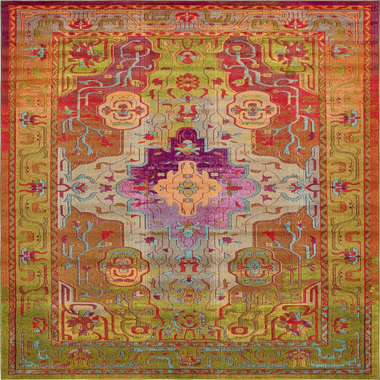 Primary color is Multi. Colors in this rug include: Multi, Blue, Gray, Green, Navy Blue, Orange, Violet.