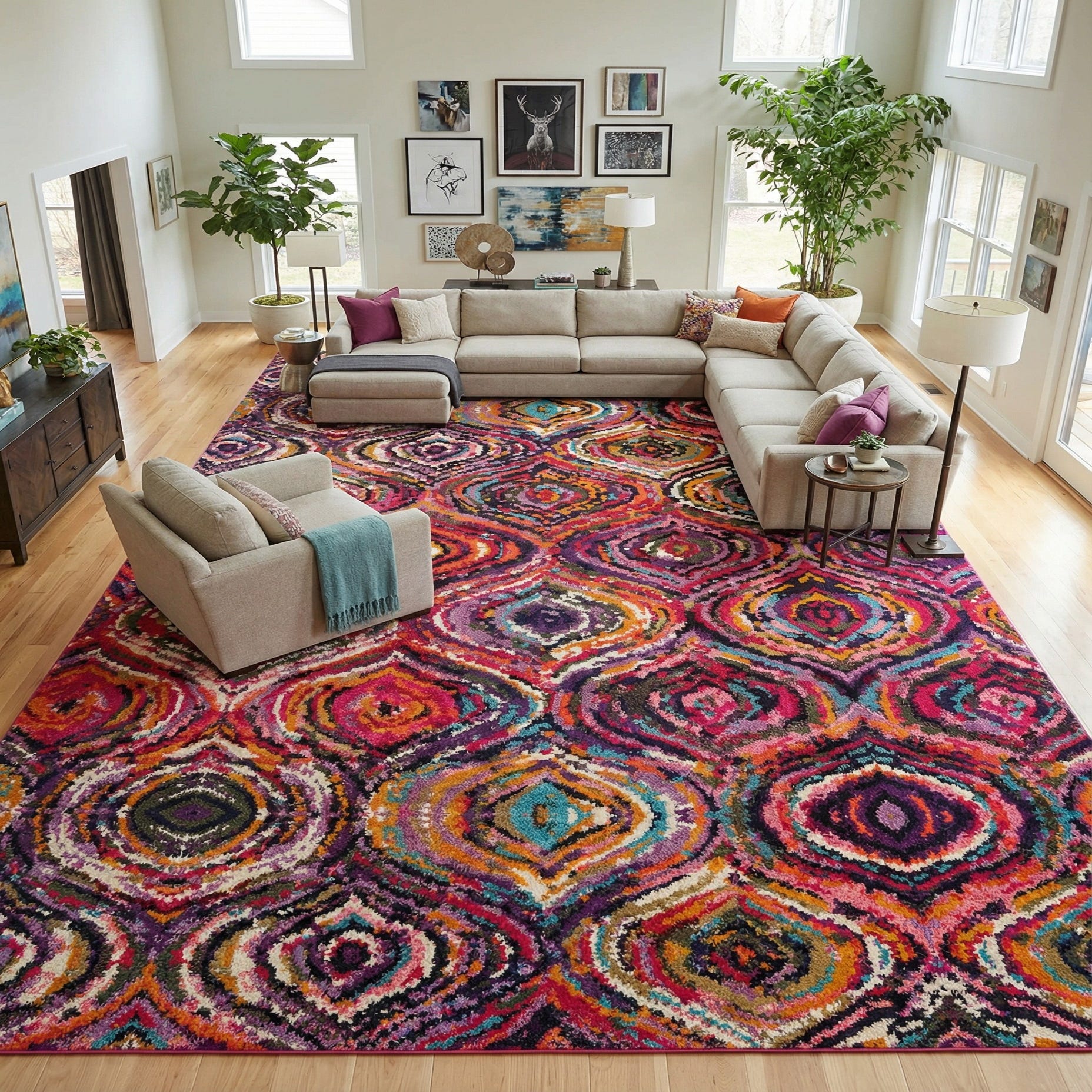 This rug works well as a bold anchor in an eclectic or bohemian living room, paired with velvet sofas, warm wood furniture, and mixed-metal accents. It’s also well-suited to a modern maximalist interior where layered color and pattern are embraced, or placed beneath a coffee table to ground a seating area. For a more restrained scheme, let the rug be the focal point against neutral walls and light wood floors, or layer it over a natural fiber rug to add color and softness to an entryway, playroom, or creative studio.