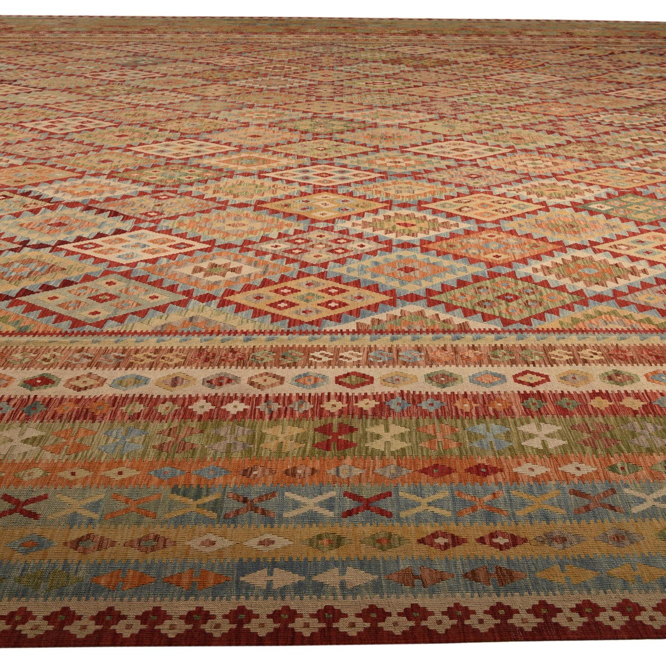 This Kilim Maymana collection rug features a dynamic geometric pattern, rendered in a vibrant palette that includes beige, blue, brown, red, light blue, gold, green, and violet on a multi-color background. The hand-woven construction from 100% wool ensures both durability and a soft texture underfoot. Accentuated with a traditional fringe, this palace-sized rug is imbued with a sense of heritage and craftsmanship.