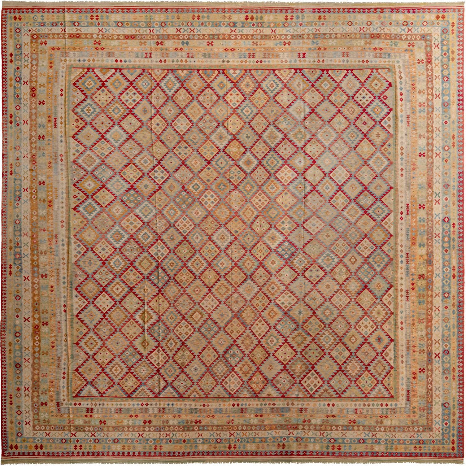 A large rectangular Kilim Maymana rug featuring a vibrant multi-colored tribal diamond pattern with a wide border, suitable for a living room.