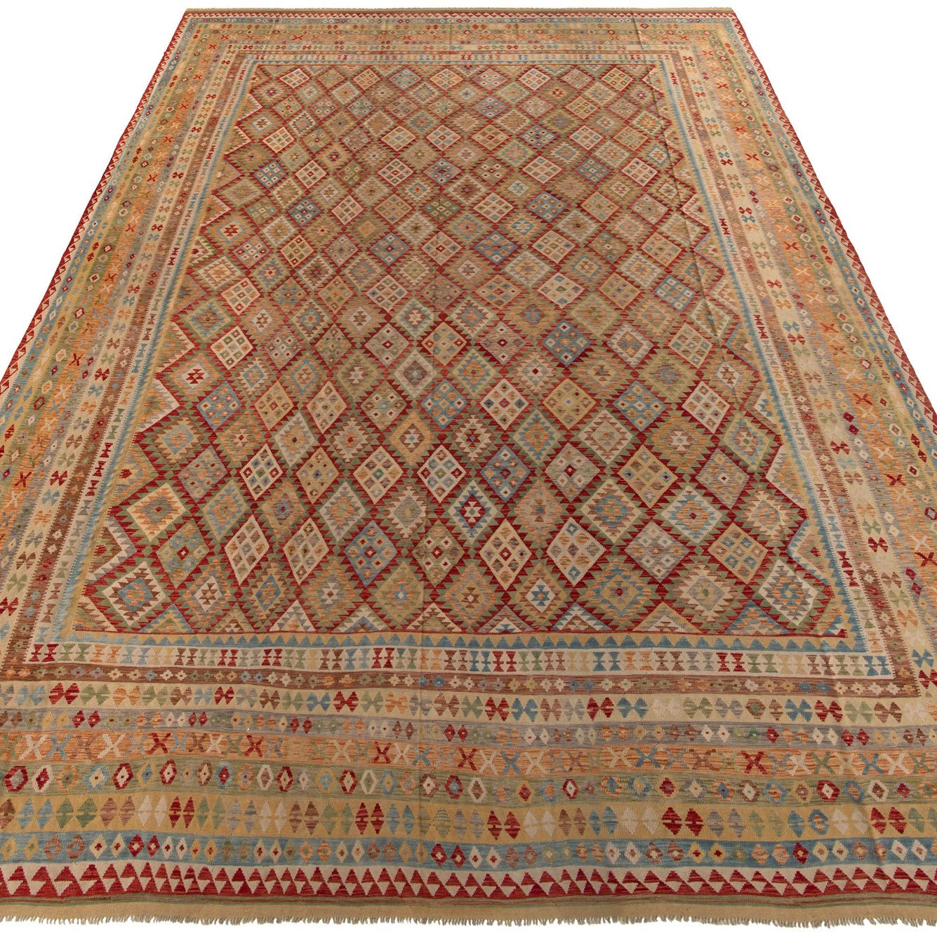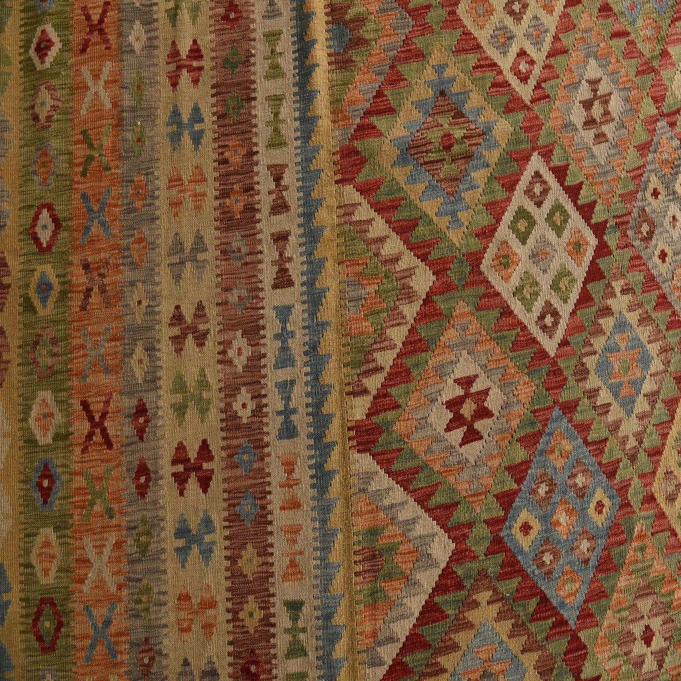 A large rectangular Kilim Maymana rug featuring a multi-colored tribal diamond pattern and a decorative border, suitable for a living room.