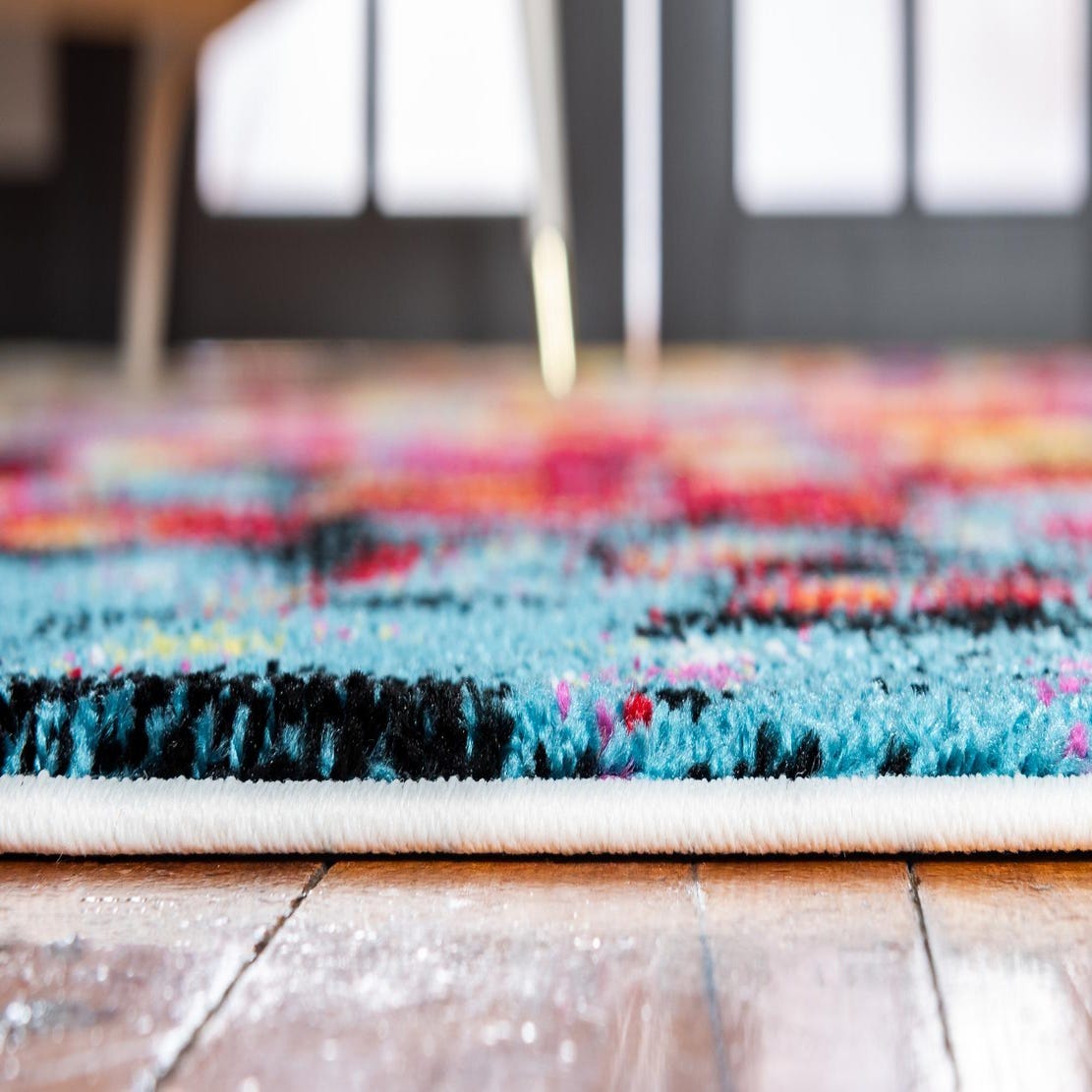 Machine-made of 100% polypropylene, the rug has a low-pile, softly cushioned surface that feels smooth underfoot and holds color well. Its vivid palette and contemporary style work well as an anchor in a modern living room or family space, add a pop of color beneath a round dining table, or bring personality to a bedroom or entry. Pair it with neutral upholstery to let the rug lead the scheme, or coordinate with mid-century and eclectic pieces for a richer, layered look.