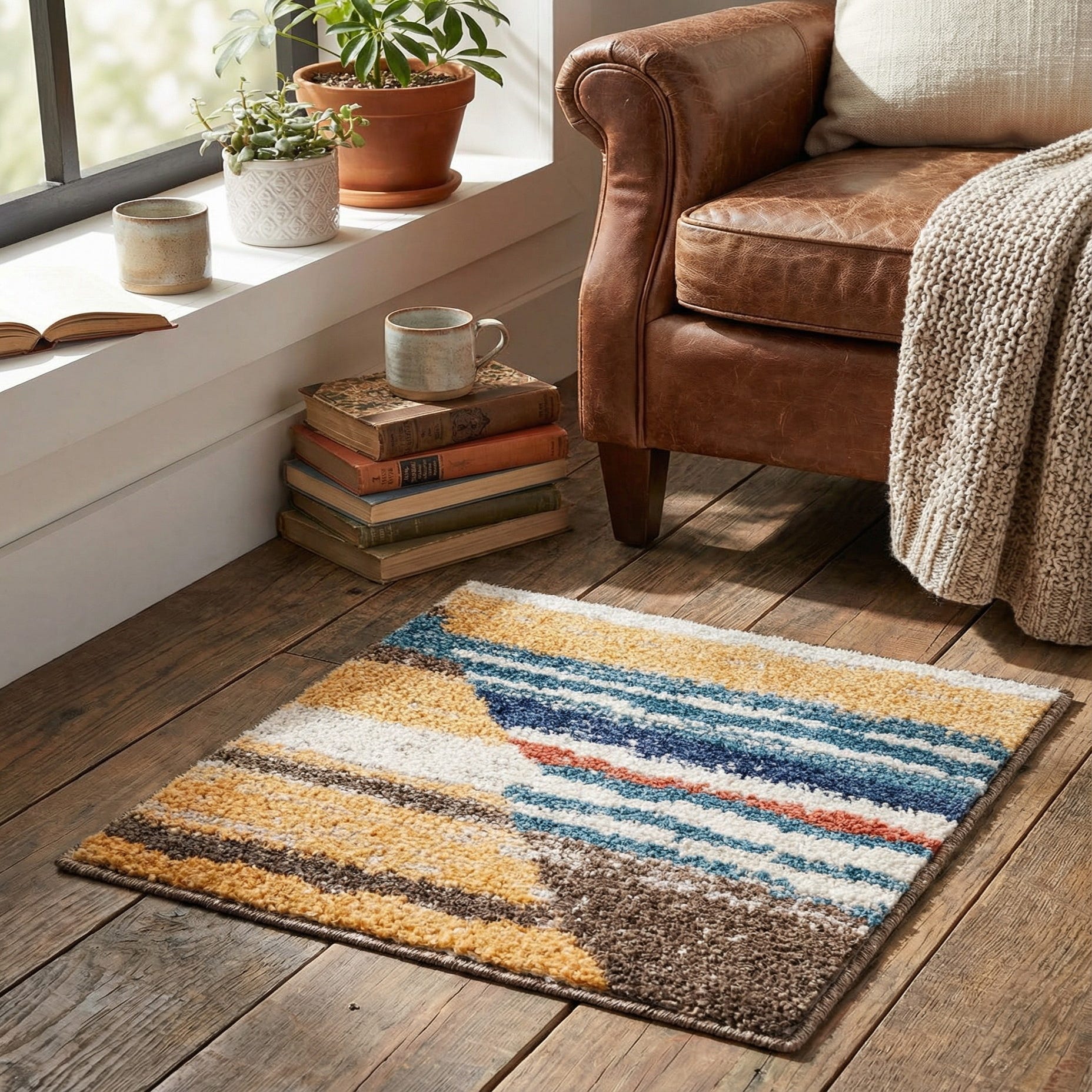Bold, painterly bands and soft color blocks form an abstract stripe pattern on a multi background, where layered hues of blue and light blue meet warm yellow and light brown fields, with ivory ribbons, rust red accents and deeper brown anchors. The cut-pile surface has a plush, slightly shaggy hand that invites you to run your fingers across the dense polypropylene fibers; the finished texture has a gentle cushion underfoot and a subtle, low-luster finish that enhances the layered color play.