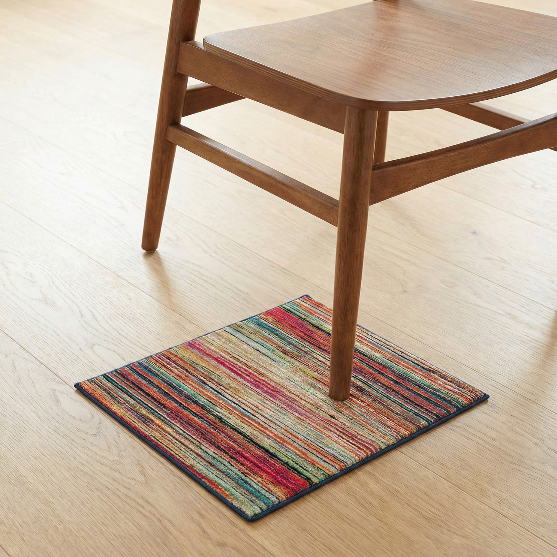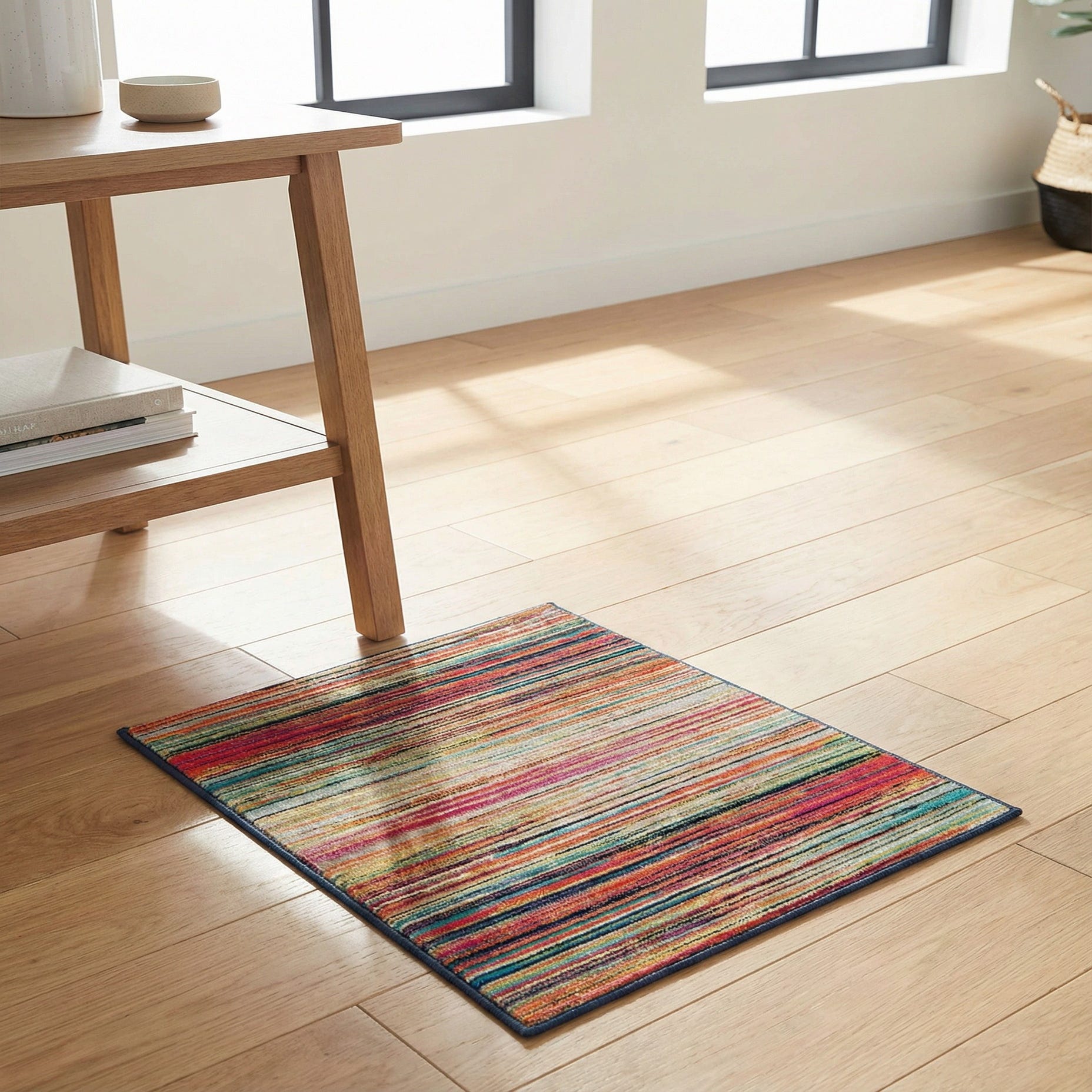 Machine made from 100% polypropylene, this sample piece offers a practical, colorful anchor for many interiors. It works well under a neutral sofa to introduce bold color, as a focal layer in a modern or mid-century living room, or in an energetic family space or playroom where pattern and color lift the mood. The striped geometry also pairs nicely with simple, solid furnishings and woven accents for a balanced, contemporary scheme.